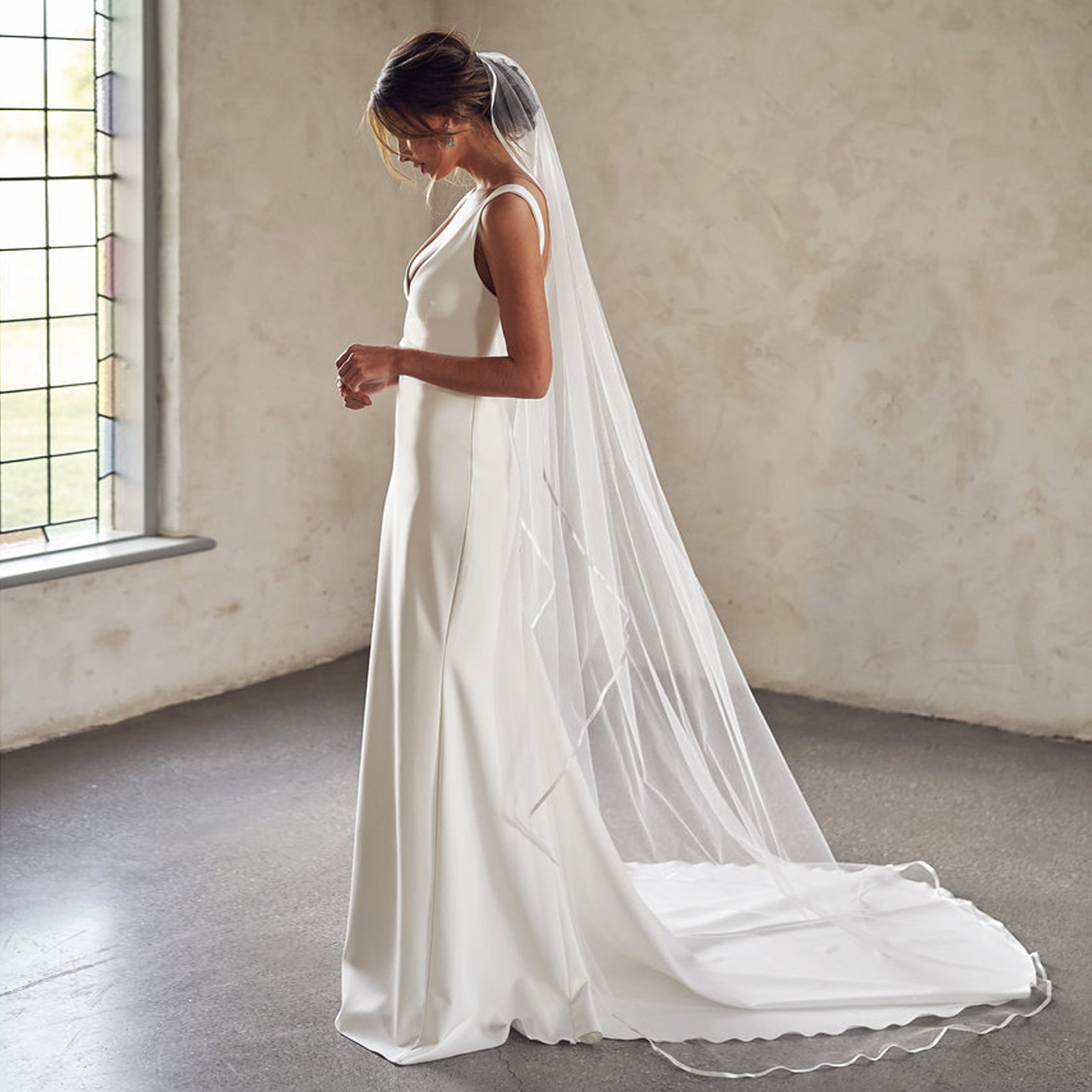 1 層ウェディングベールエレガントなビーズエッジクリスタルパールエッジベールホワイトアイボリーロングブライダルベールコーム付きカスタム大聖堂ベール