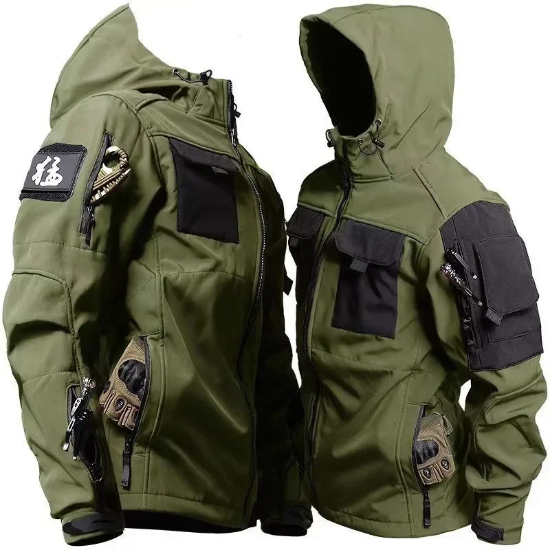 男性用タクティカルポケット付き防水タクティカルジャケット,ソフトシェルフード付きシャークスキン,ワークウェアセット,アウトドアスーツ,防風,冬