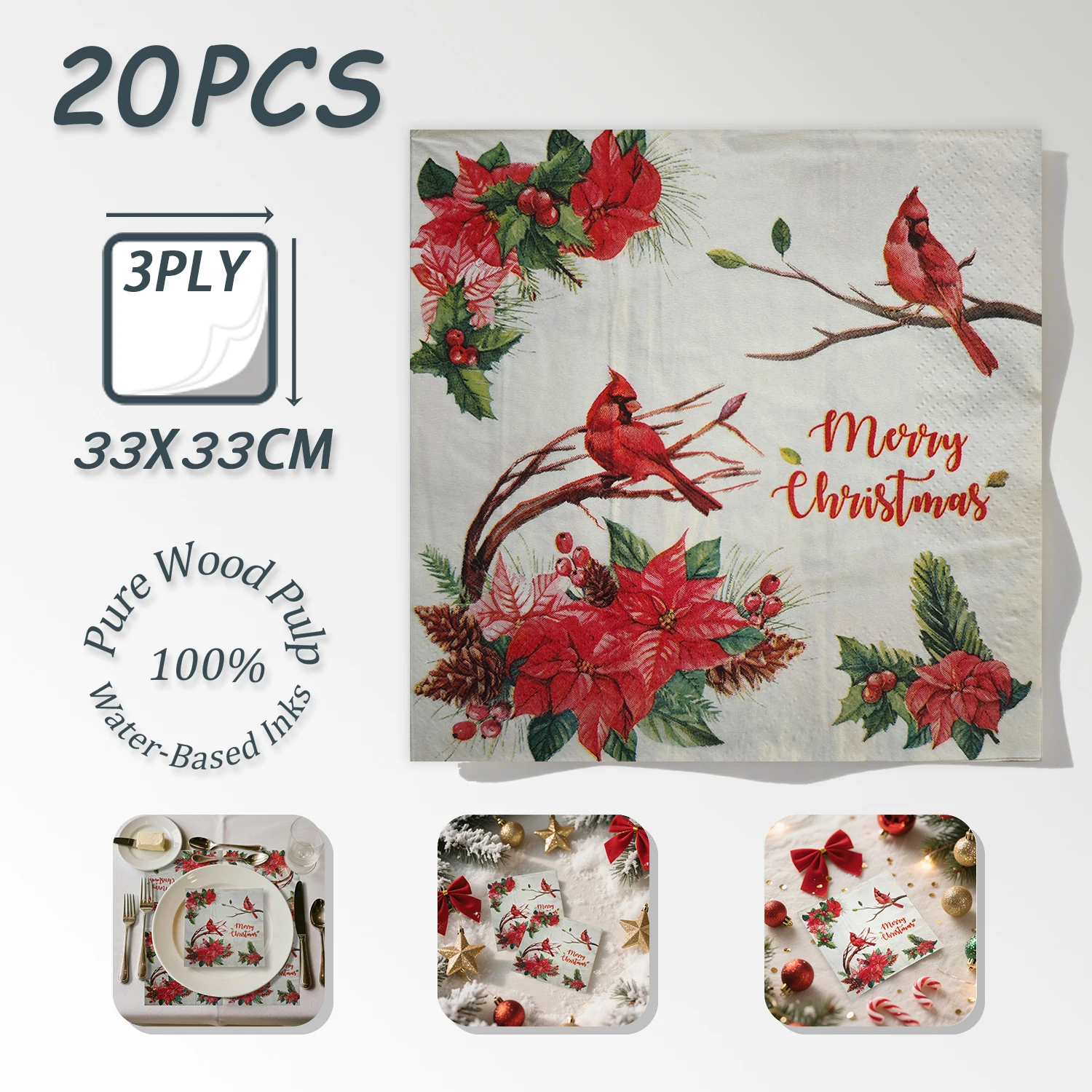 ♡Quick view20pcs Festive Christmas Cardinal Bird Poinsettia Holly Berries Paper Napkins 33x33cm Decoupage Napkins Disposable for Winter38445 VNDHot★★★★★5.0