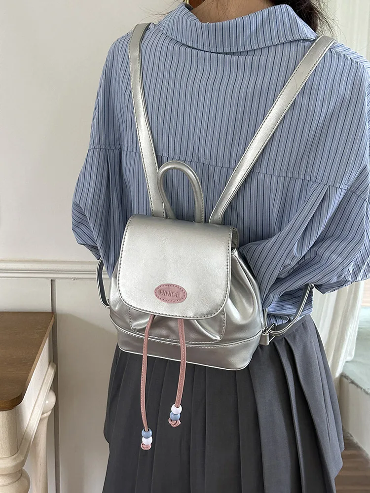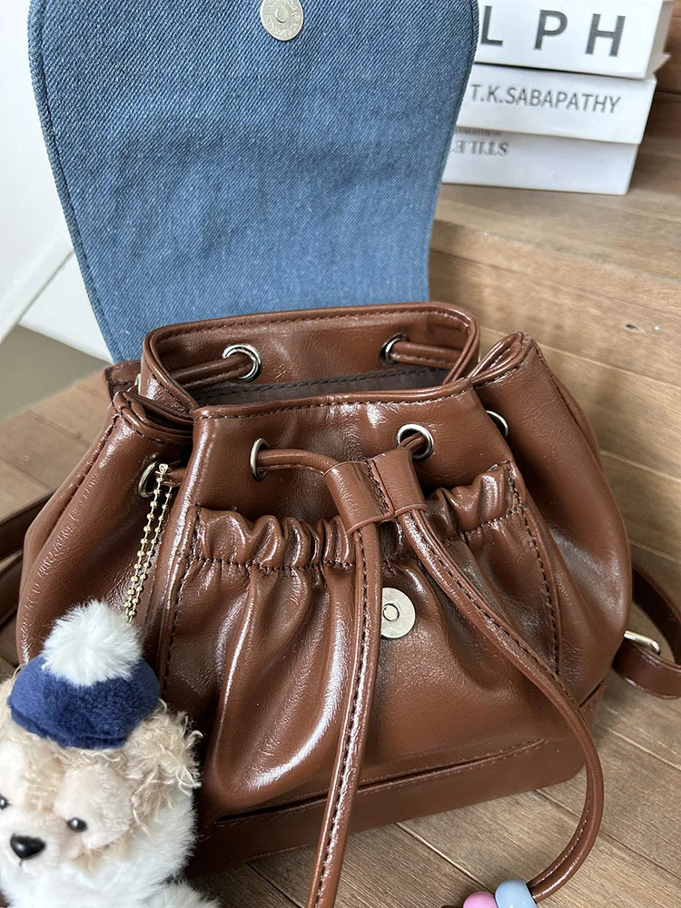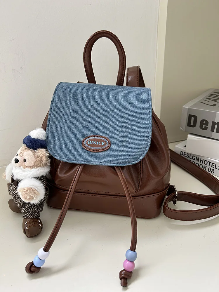 レトロかわいいデニムカラーブロックバックパック学生ガールショルダーバッグソフトハンドバッグ韓国スタイルレジャー防水小型バケツ形状 - TopDealBox