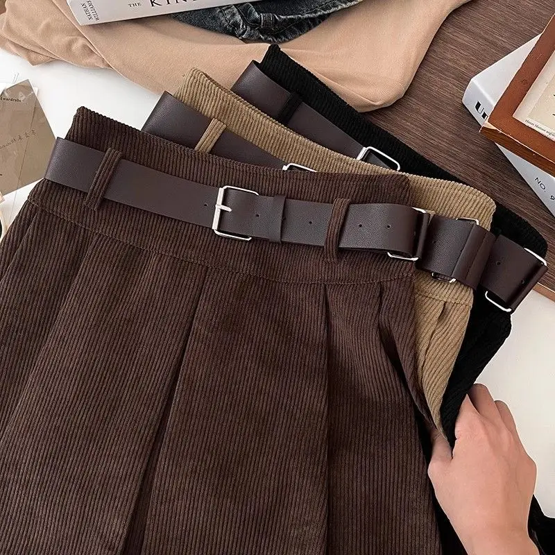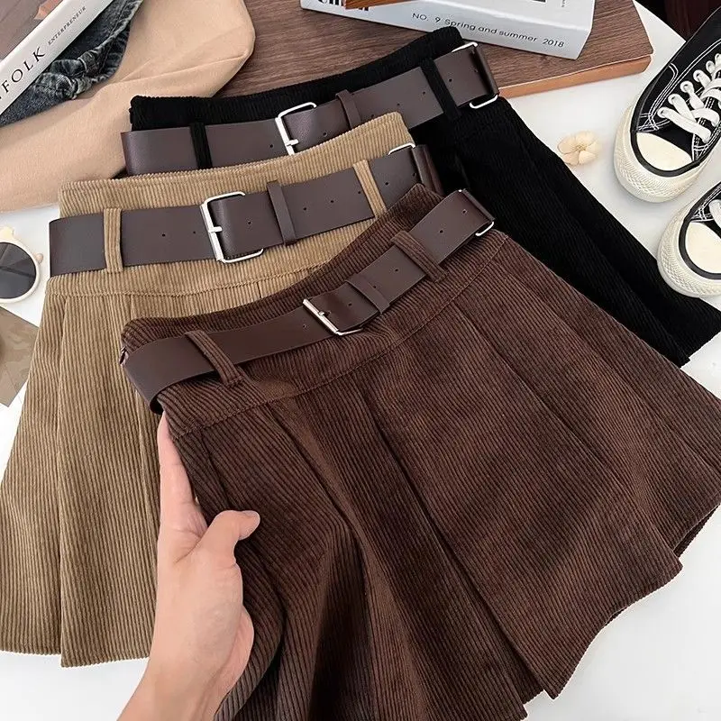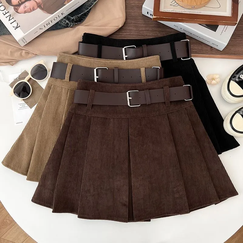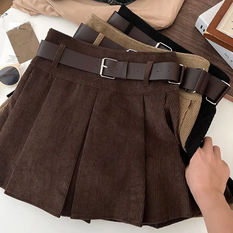 レトロコーデュロイハイウエストベルト付きミニスカート女性のための春秋冬新スタイル痩身プリーツショートスカート - TopDealBox