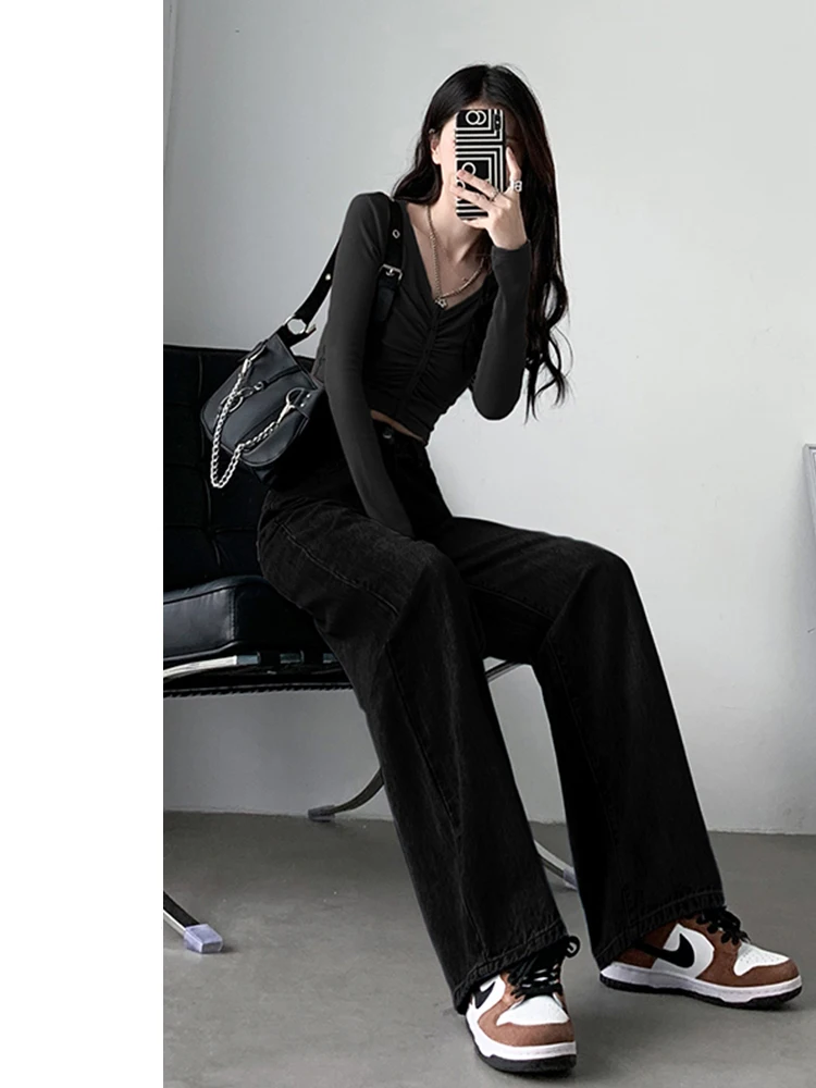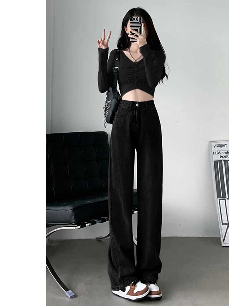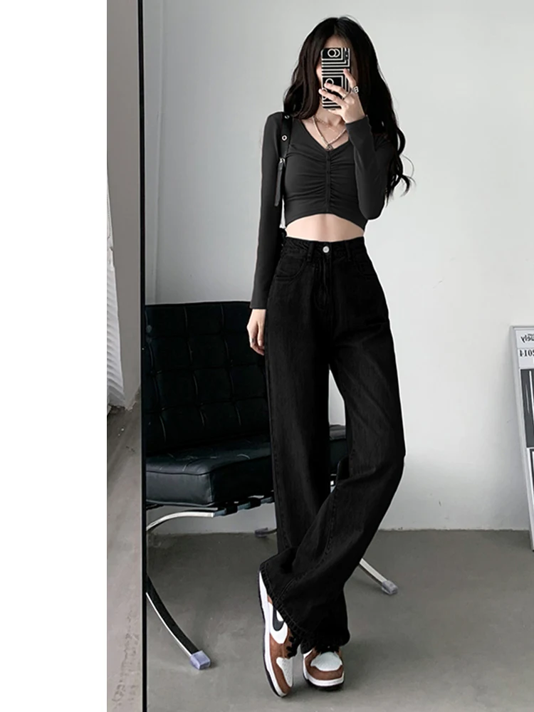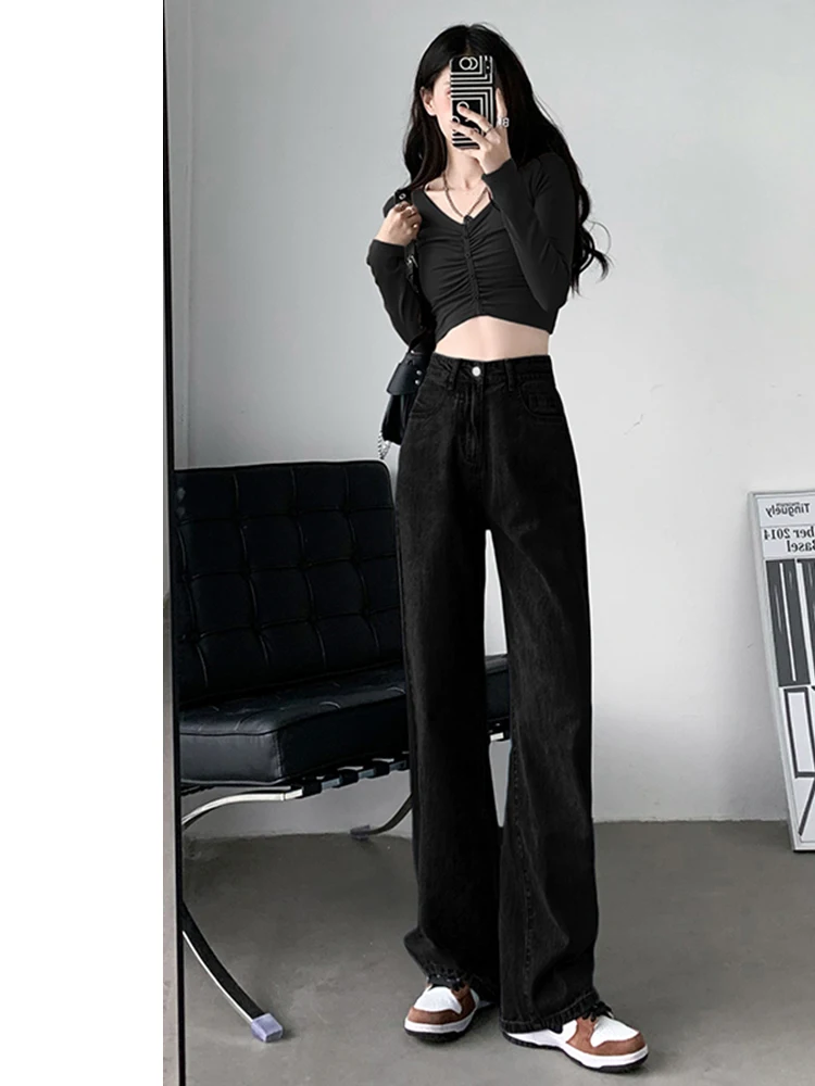 黒ストレートレッグジーンズ女性の春秋カジュアルハイウエストルーズワイドレッグパンツアメリカンスタイル痩身ジーンズ - TopDealBox