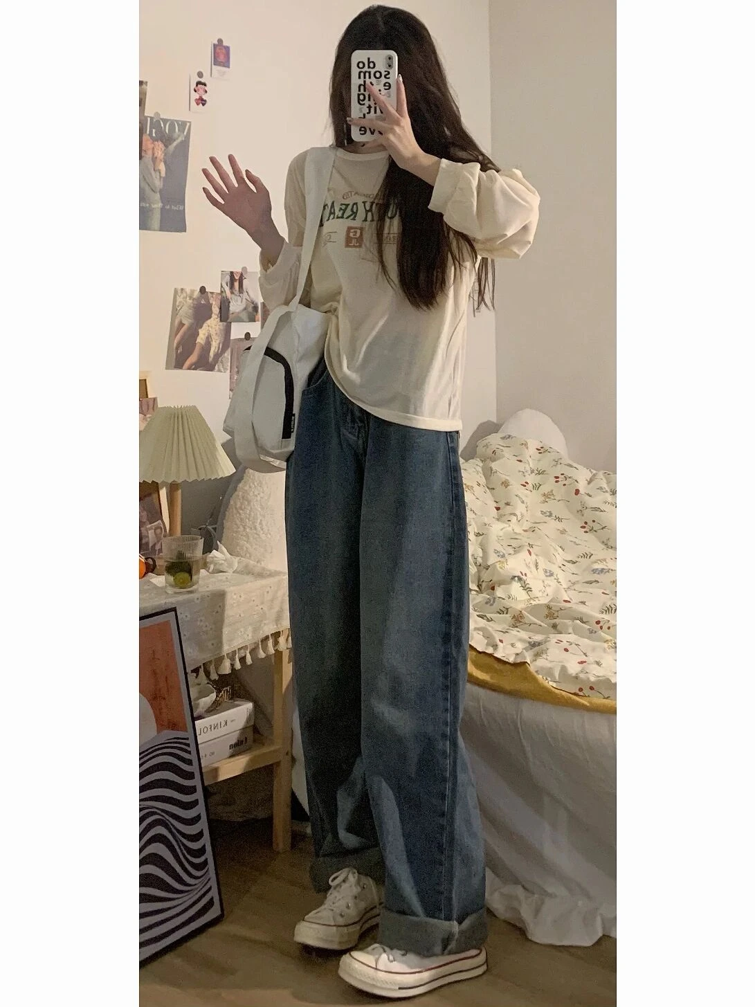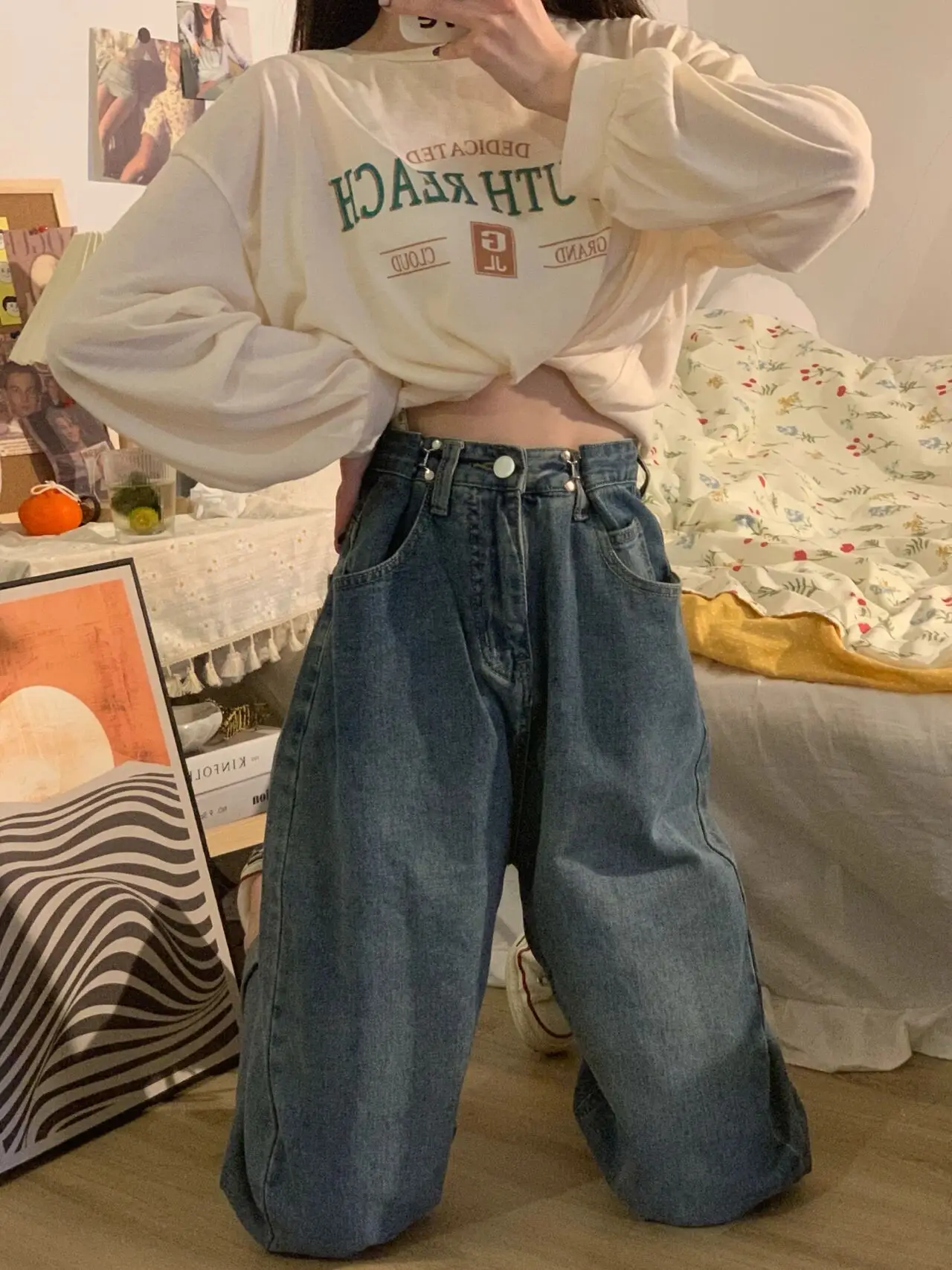 ハイウエストワイドレッグフリース裏地ルーズフィット女性のジーンズ春秋トレンディブルーデニムパンツストレートカットズボン - TopDealBox