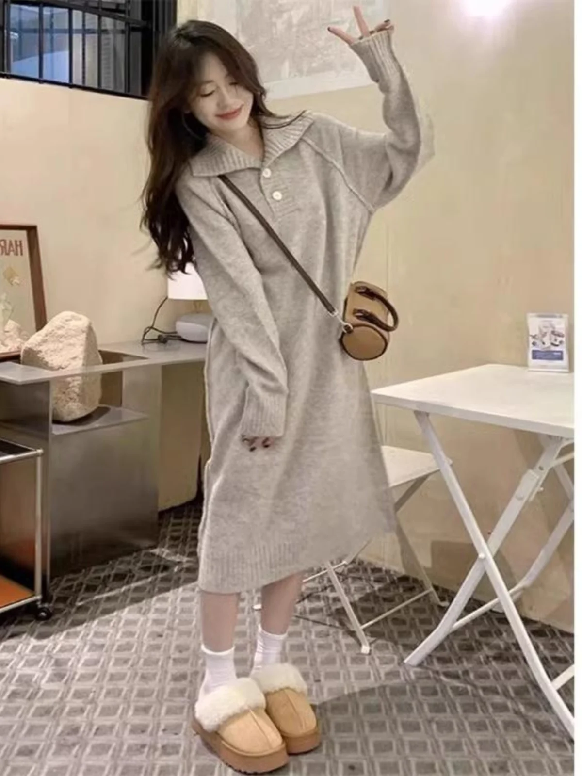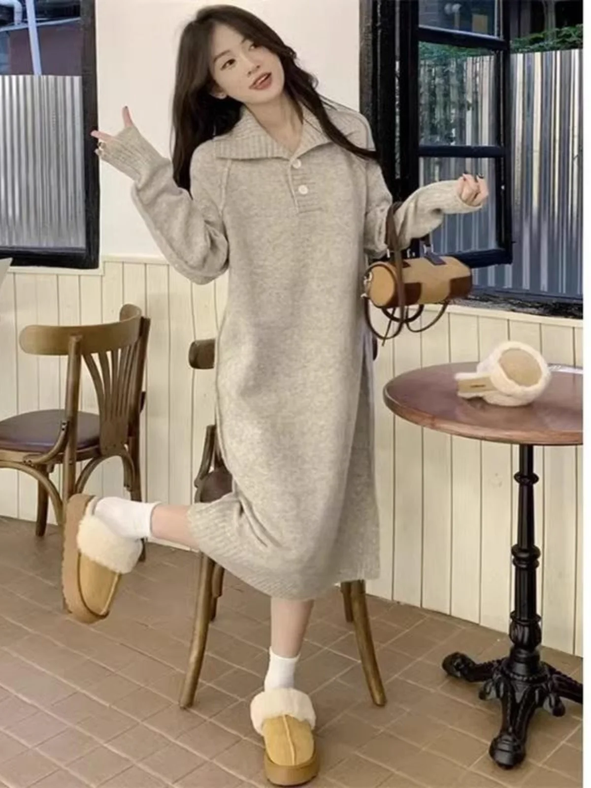 ポロカラーのミドル丈ルーズニットドレス,フレンチスタイル,秋冬 - TopDealBox