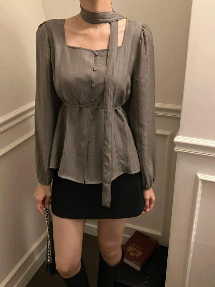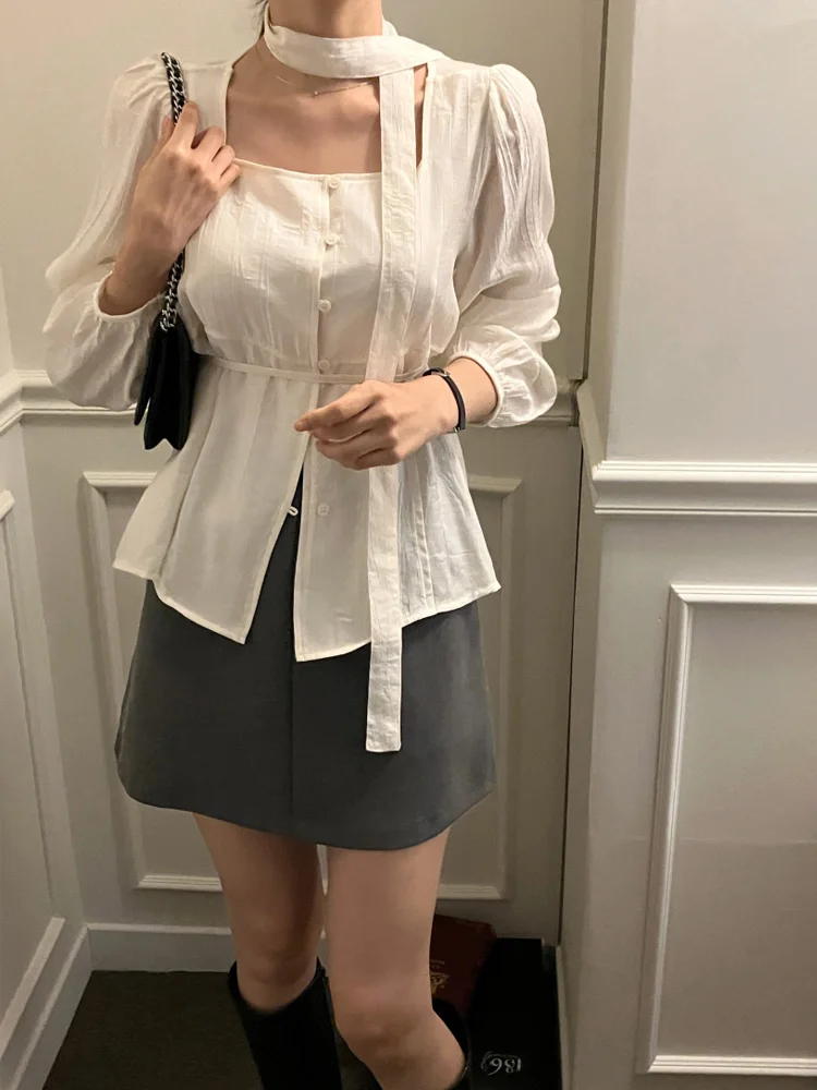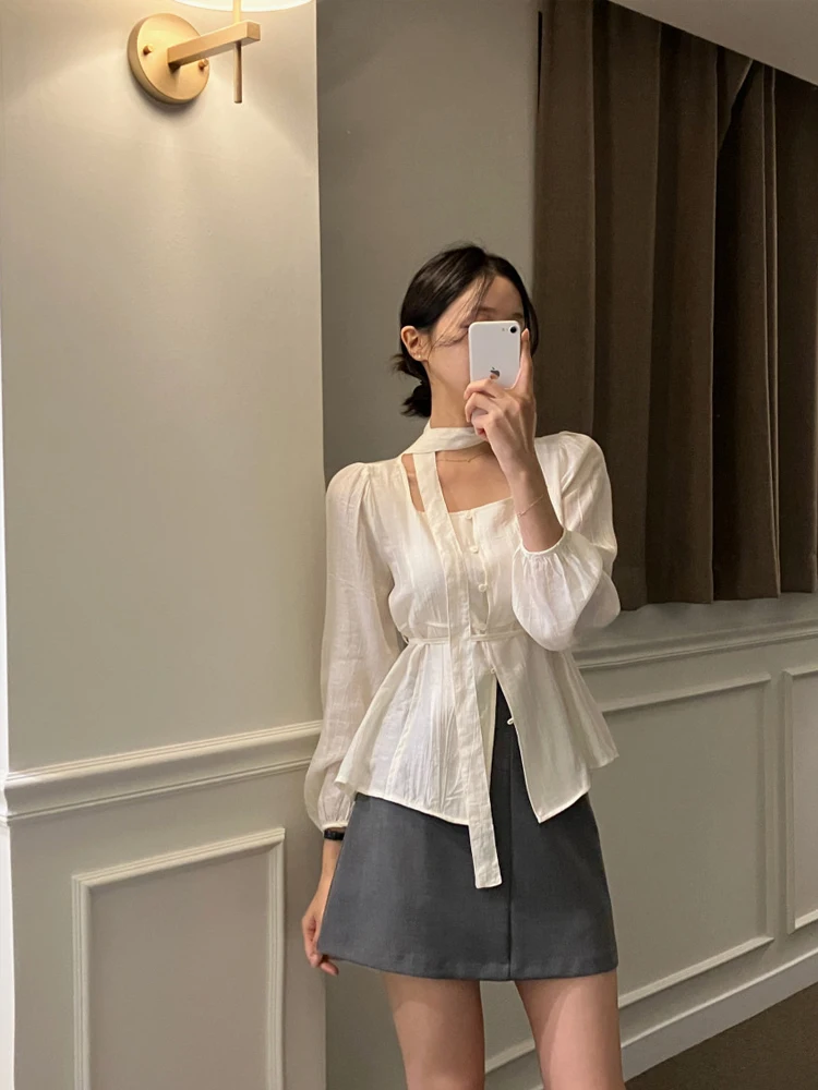 韓国スタイル長袖シャツレディースファッション春シーズン痩身ルーズフィットインナーウェアサッシュスクエアカラーデザイン - TopDealBox