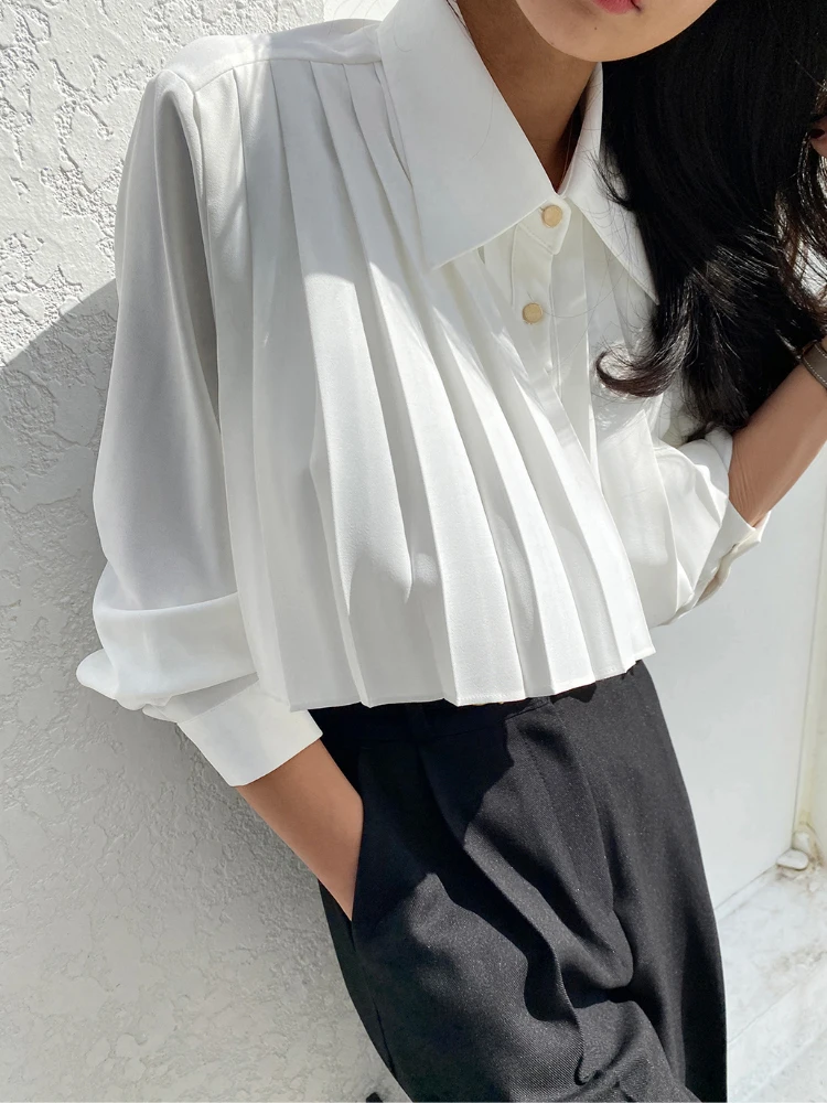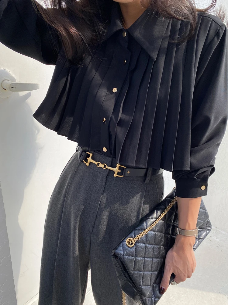 黒プリーツショートポロシャツ女性の韓国スタイル春デザインハイウエスト多用途トップ重工業ニッチポロブラウス - TopDealBox