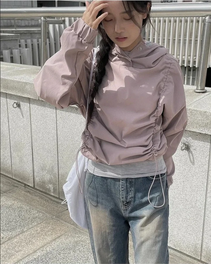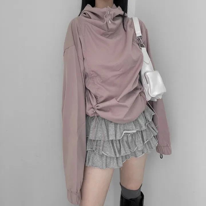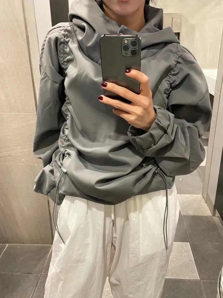 冬の新シンプルなソリッドカラーの機能的な折り目防風巾着フード付きスウェットシャツルーズ女性のストリートスタイル長袖 - TopDealBox