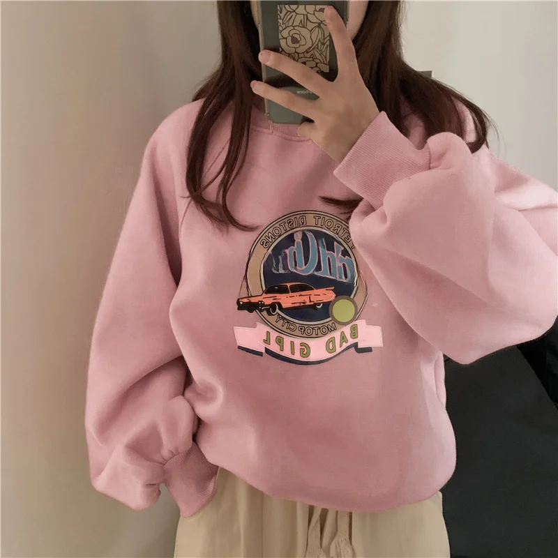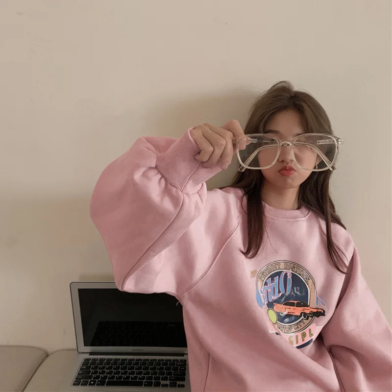 シックなプラスサイズオーバーシャ ツレディース長袖パーカーピンクトレンディなイニシャルデザインお腹カバー怠惰なスタイルショルダードロップ衣装 - TopDealBox