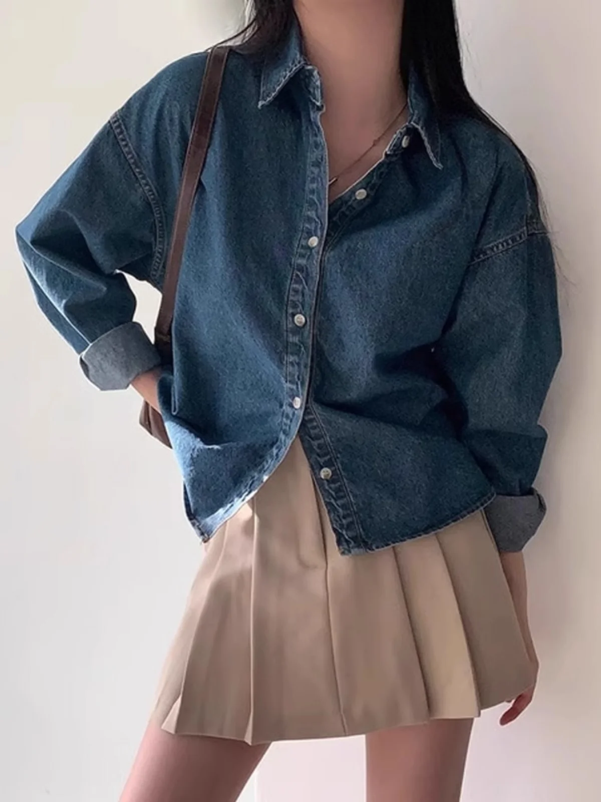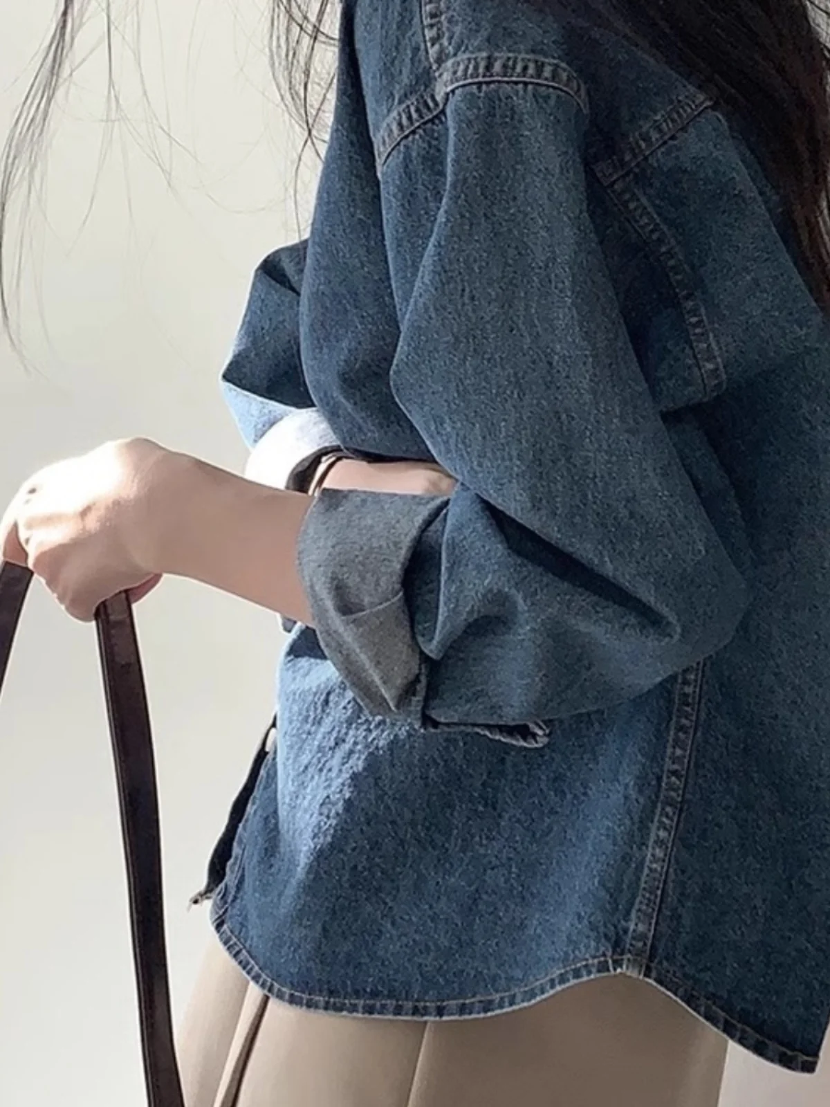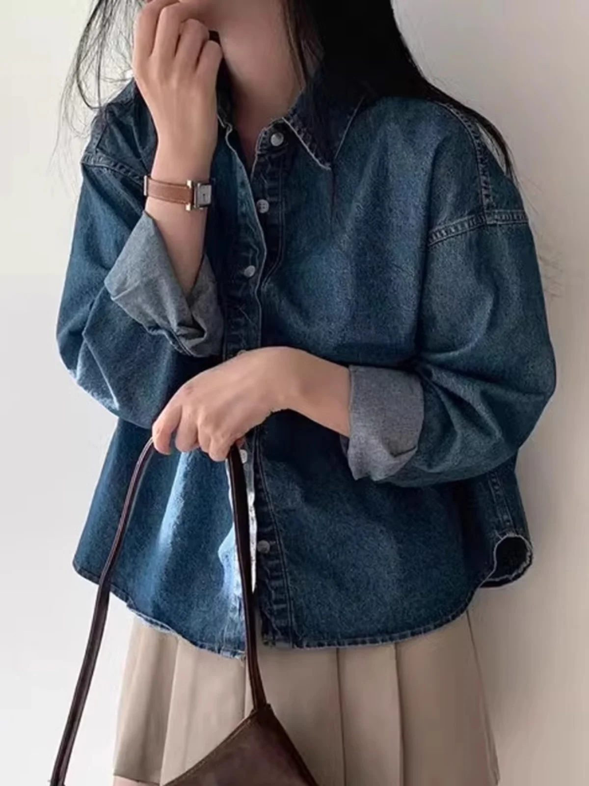 ゆったりカジュアルレディースデニムシャツヴィンテージ襟アウター韓国風早春ファッションデザインセンス長袖ピュアカラー - TopDealBox