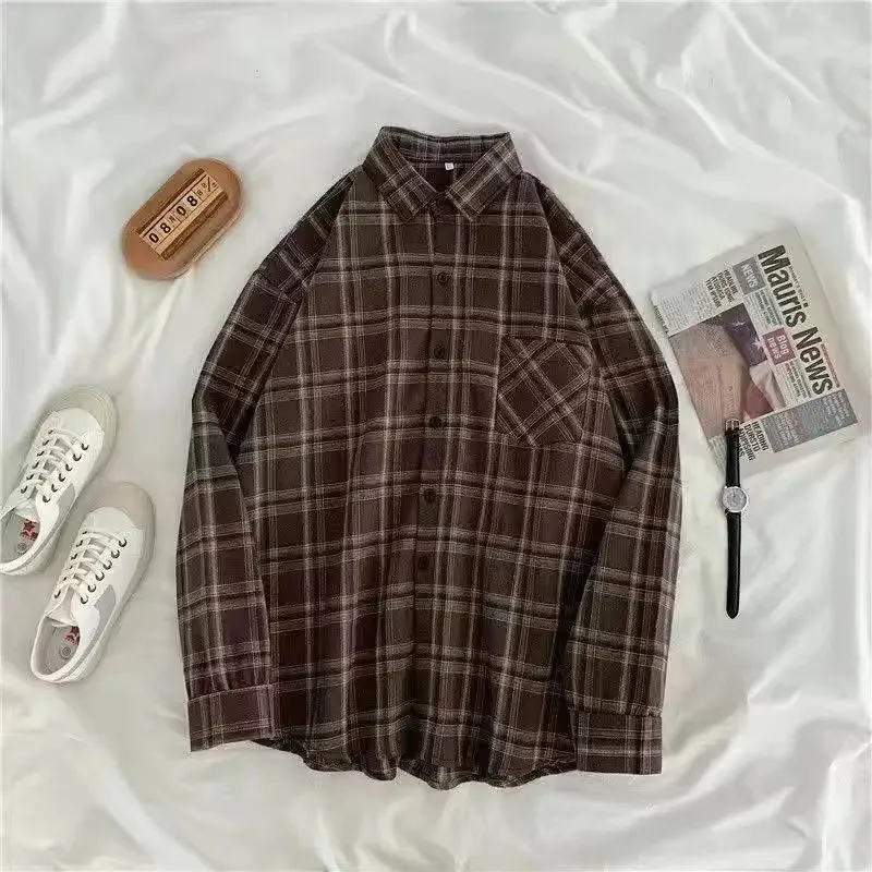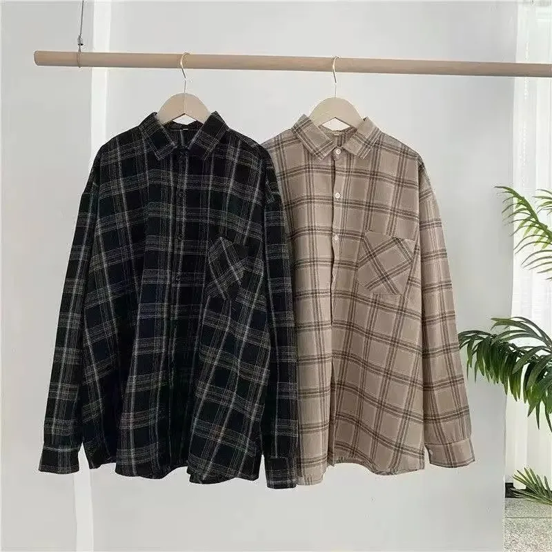 秋/冬レトロ長袖チェックシャツ韓国ファッション万能秋チェックシャツゆったり万能トップス - TopDealBox