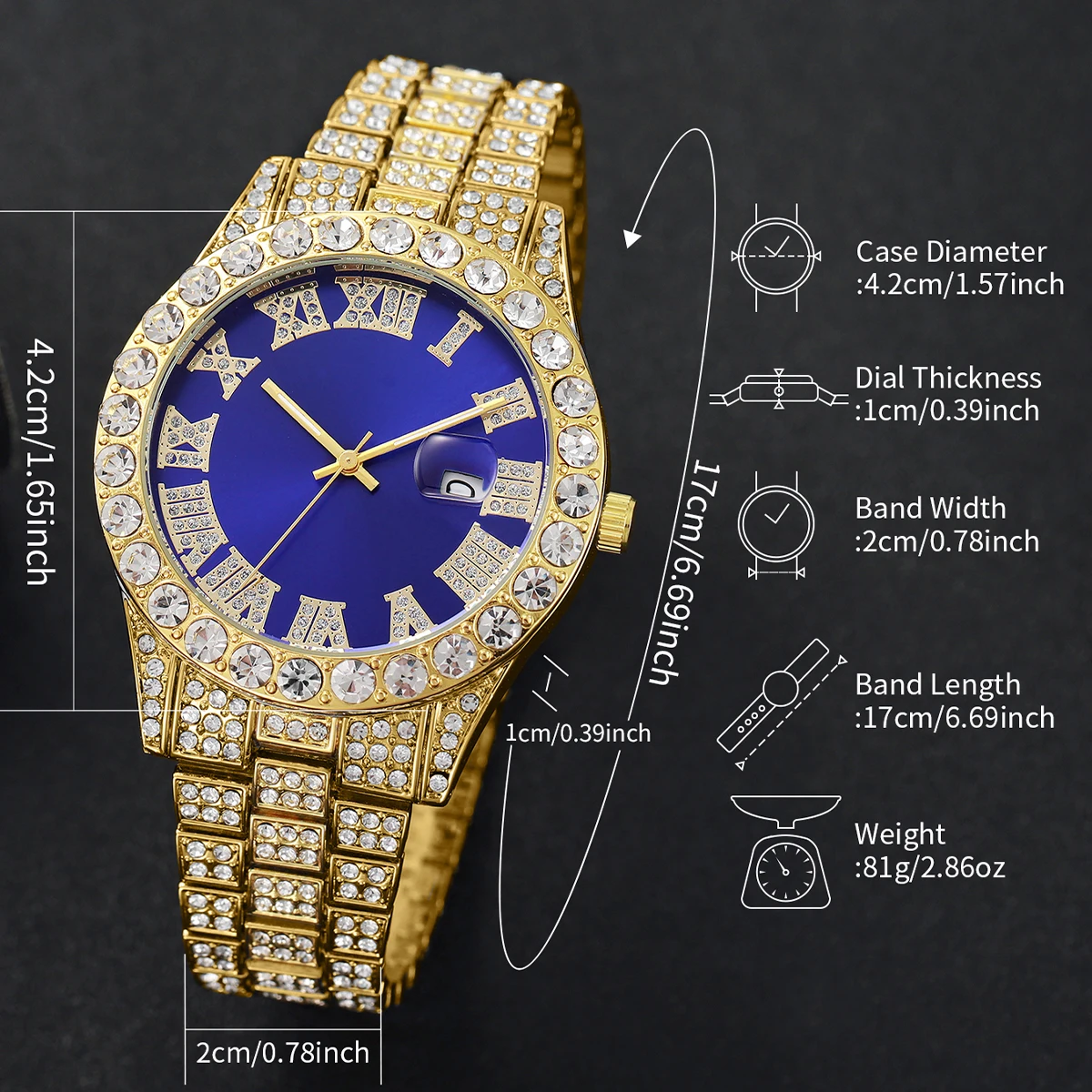 ファッションフルダイヤモンドメンズ腕時計ステンレススチールバンド男性クォーツ腕時計日付カレンダー腕時計 - TopDealBox