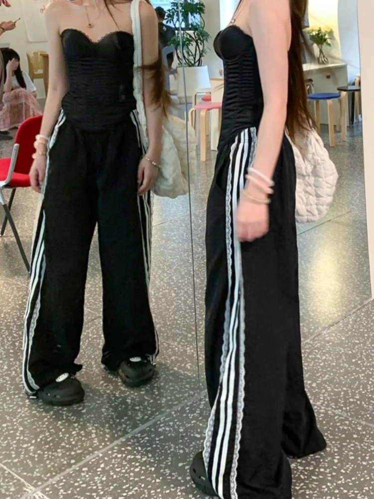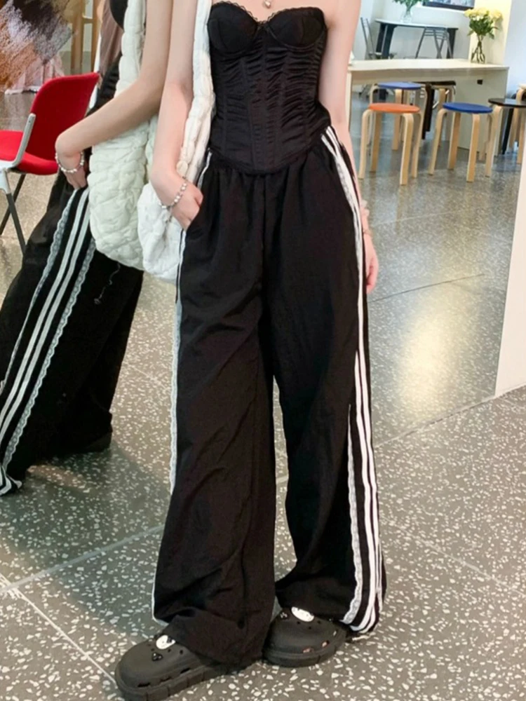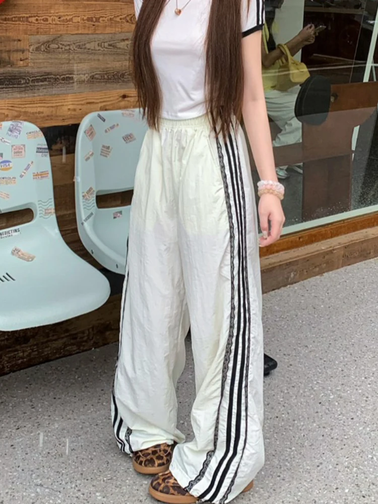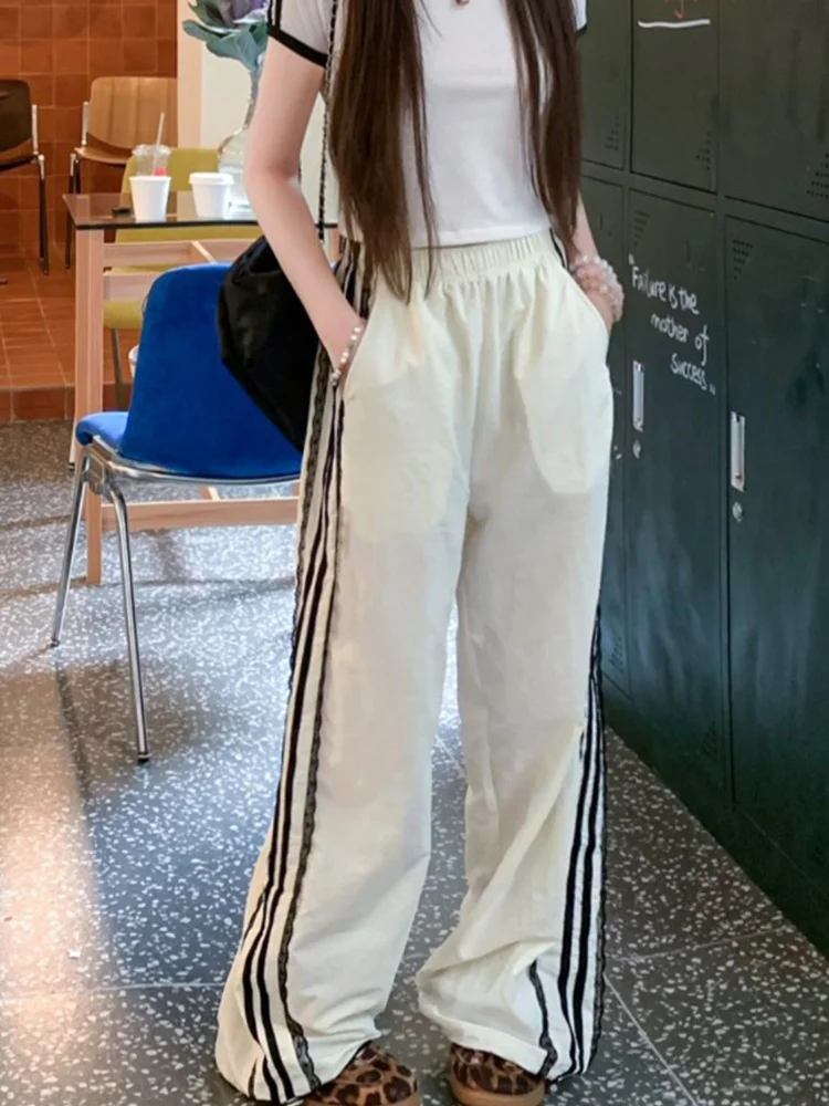 ハイウエスト痩身カジュアルパンツ女性の夏の新スタイルルーズワイドレッグ床長ズボントレンディなサイドストライプデザイン - TopDealBox