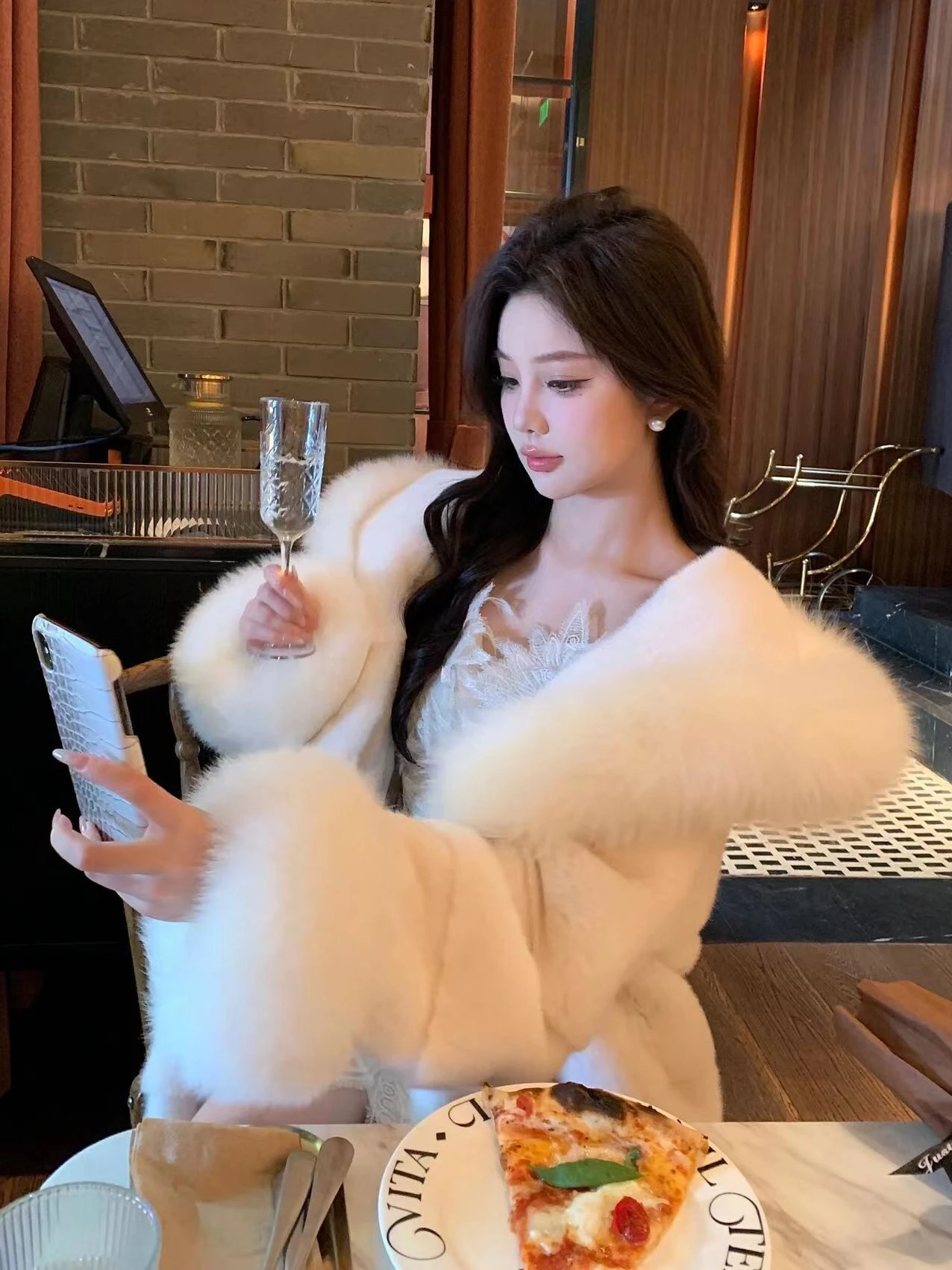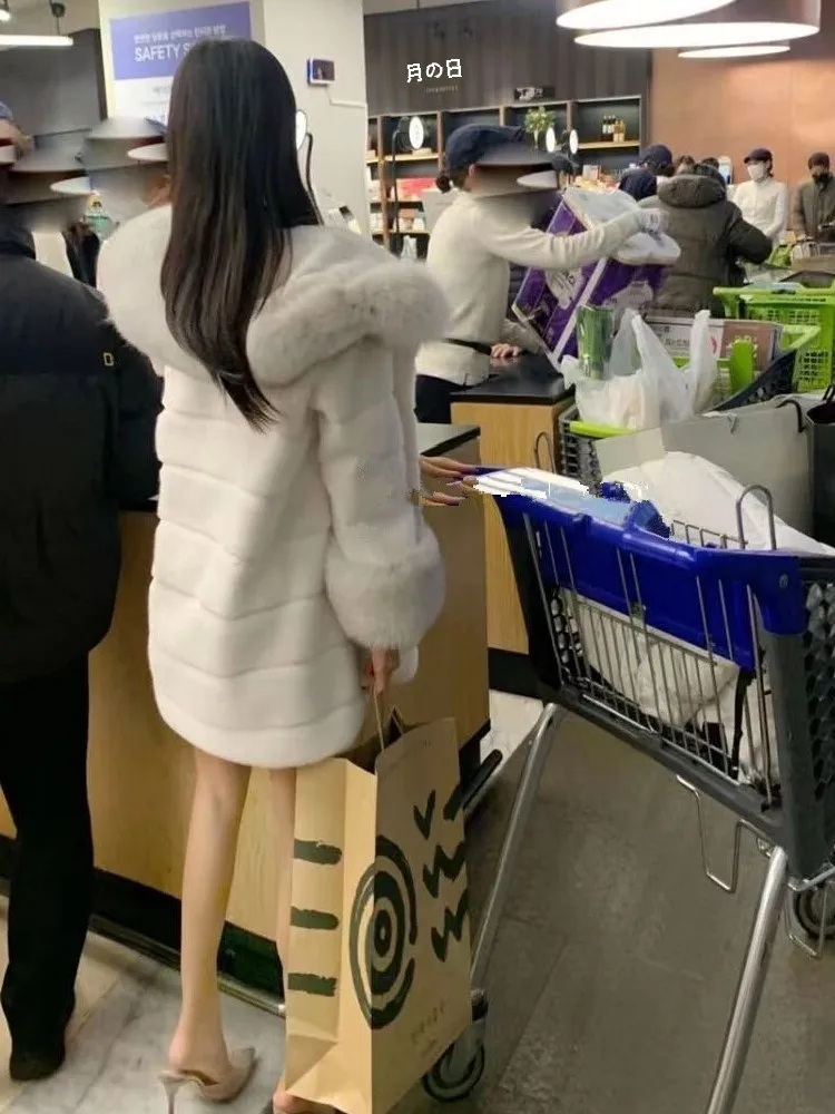 ホワイトミンクの毛皮のコートの女性のフード付きミッドレングスキツネの毛皮の襟冬の新スタイルぬいぐるみミンクレザージャケット韓国スタイル長袖 - TopDealBox