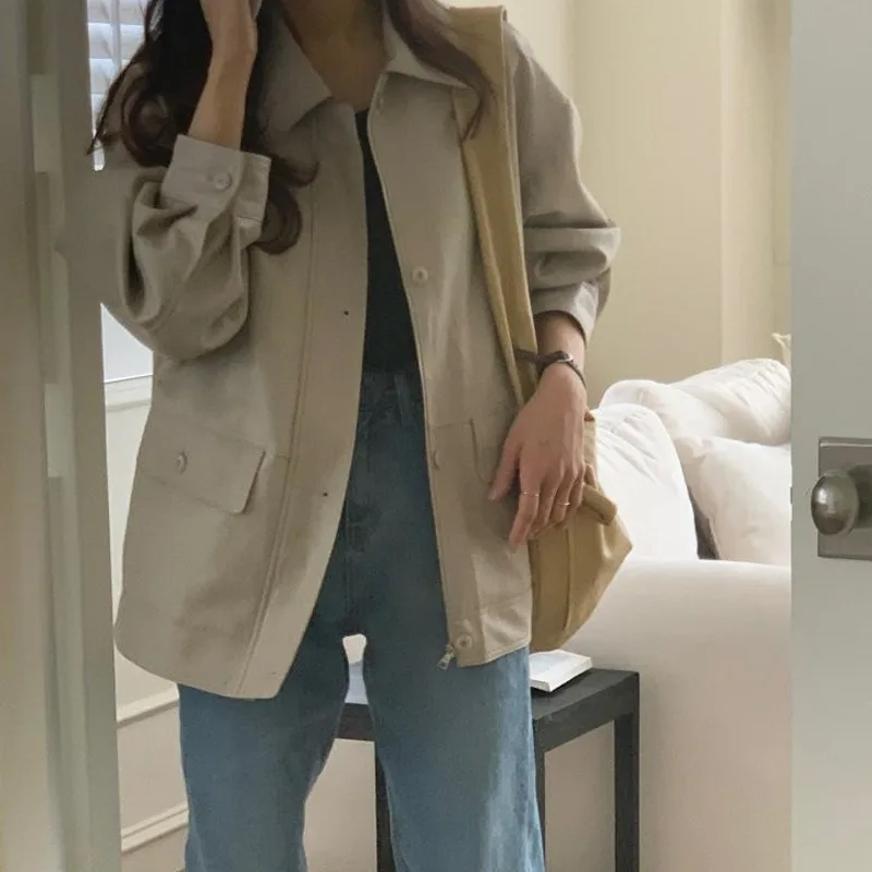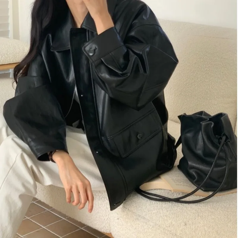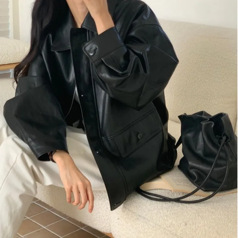 ファッショナブルなカジュアルレザージャケット秋冬ジッパーポケットスタンドカラーオールマッチアウターウェア若い女性のためのルーズフィット長袖 - TopDealBox