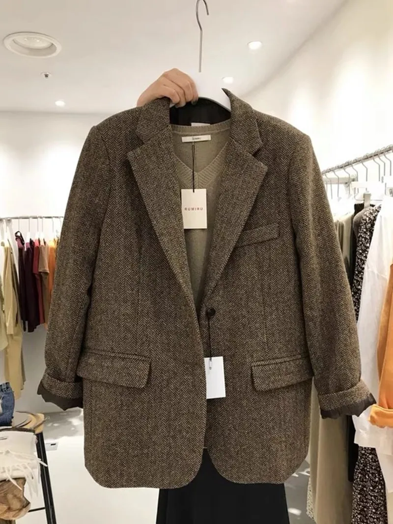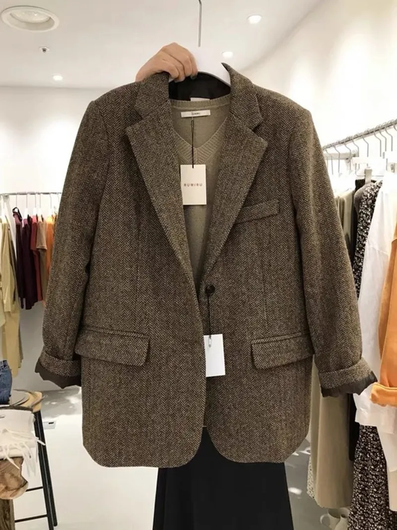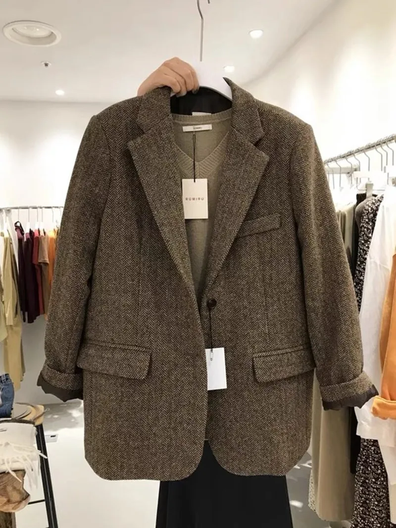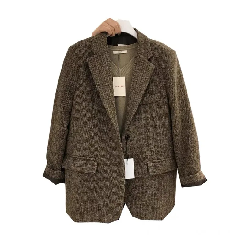 レトロウールスーツジャケット女性ルーズ痩身ツイードスタイルトップトレンディなビジネスカジュアル長袖コート冬新着 - TopDealBox