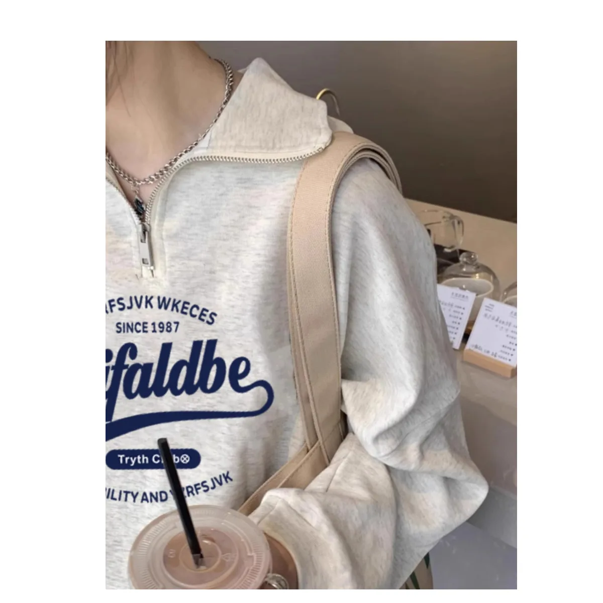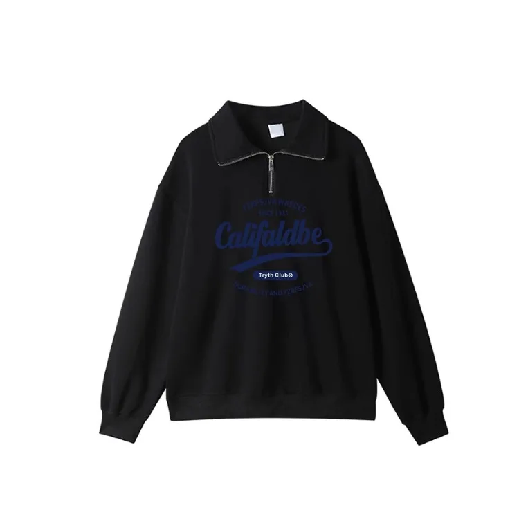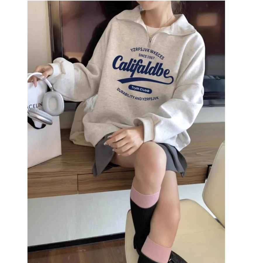 ルーズ長袖ポロネックハーフジッパートレーナー女性の韓国スタイル秋冬新レタープリント怠惰なスタイルプルオーバー - TopDealBox