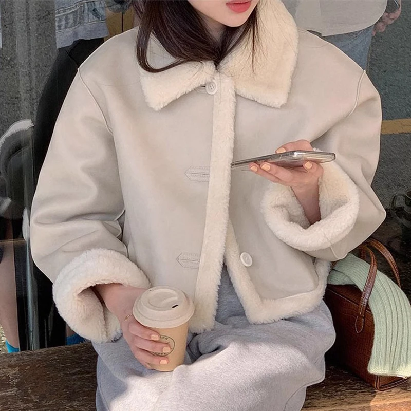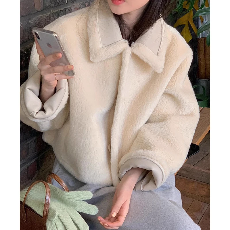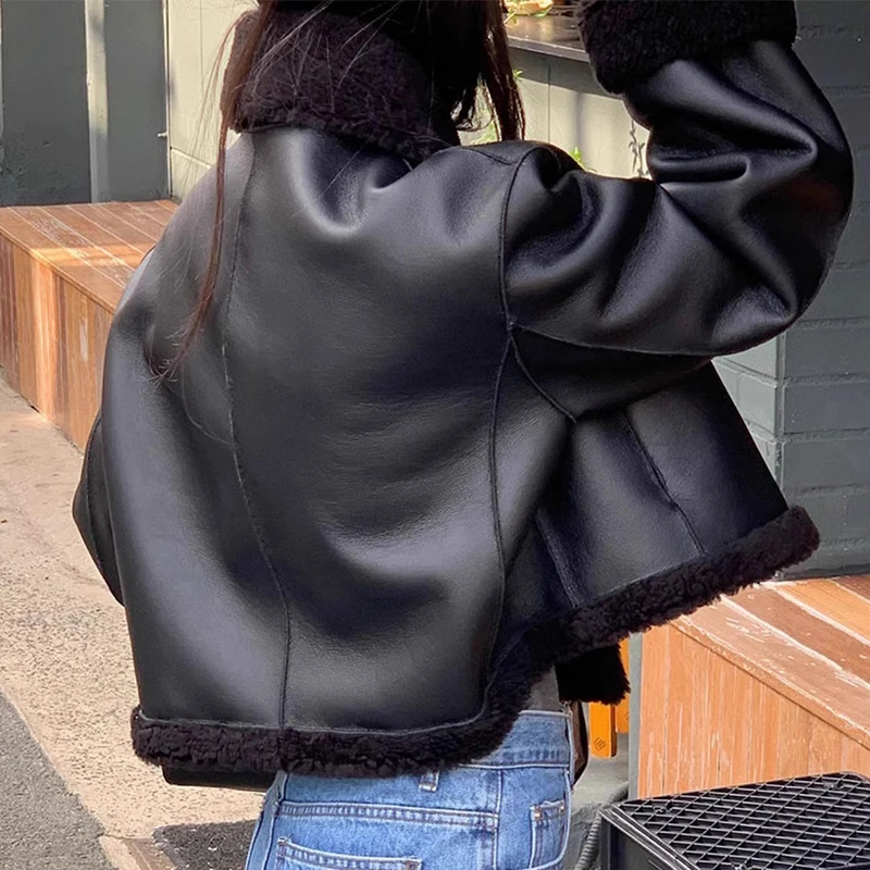 シックな秋冬ショートラムファー長袖ターンダウンカラーレディースジャケット多用途アウター両面着用革と毛皮 - TopDealBox