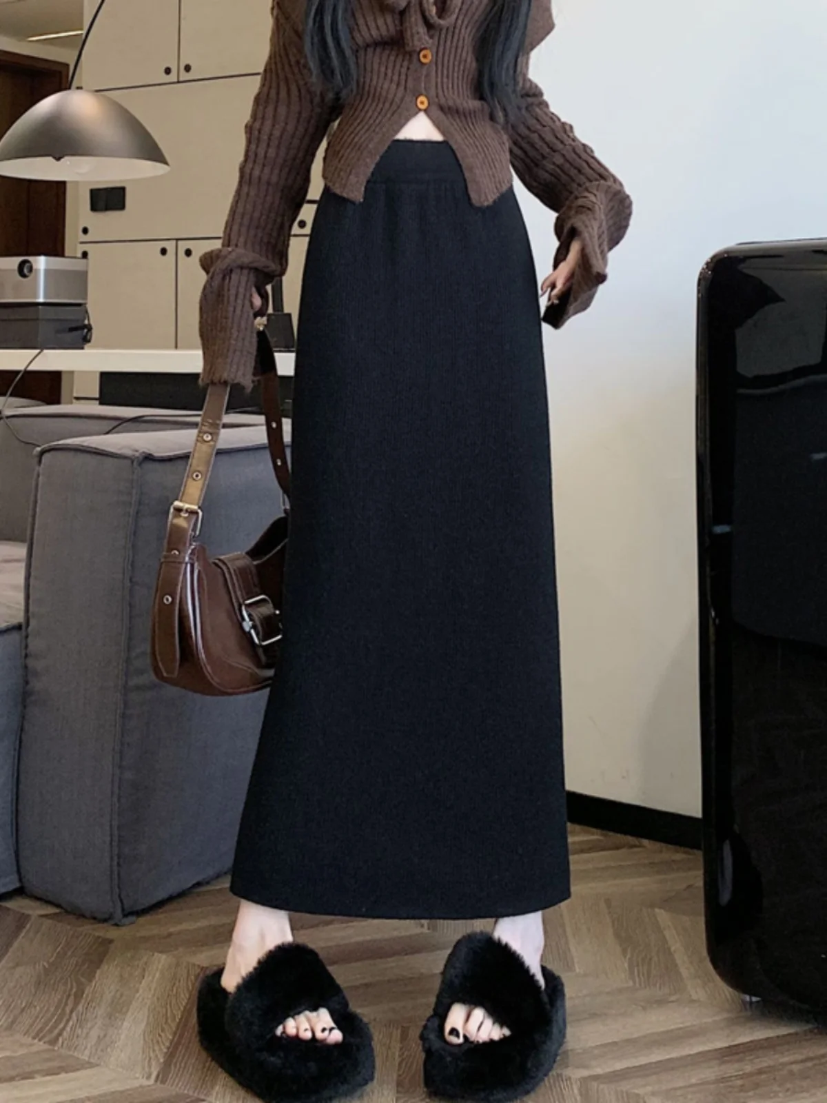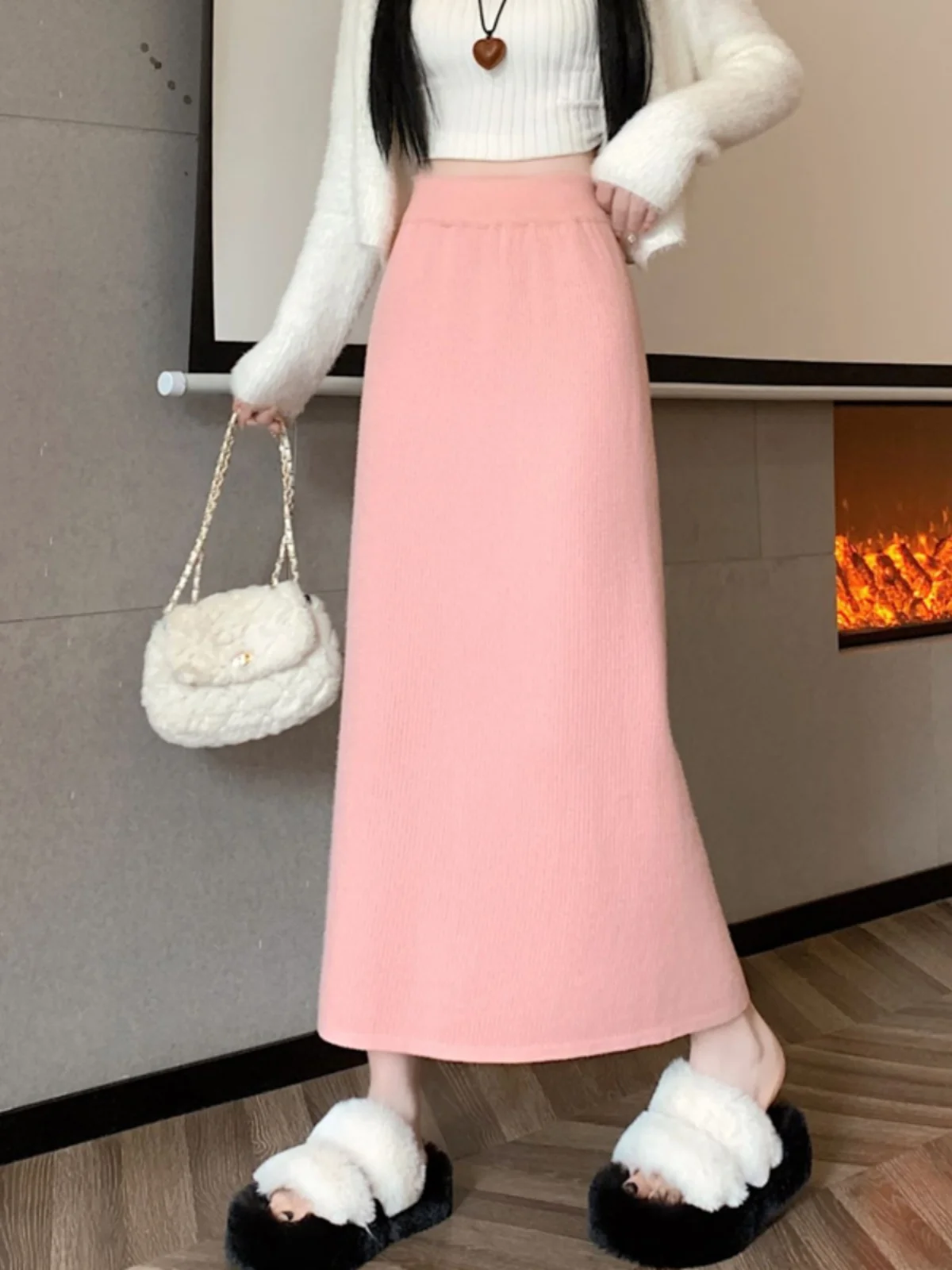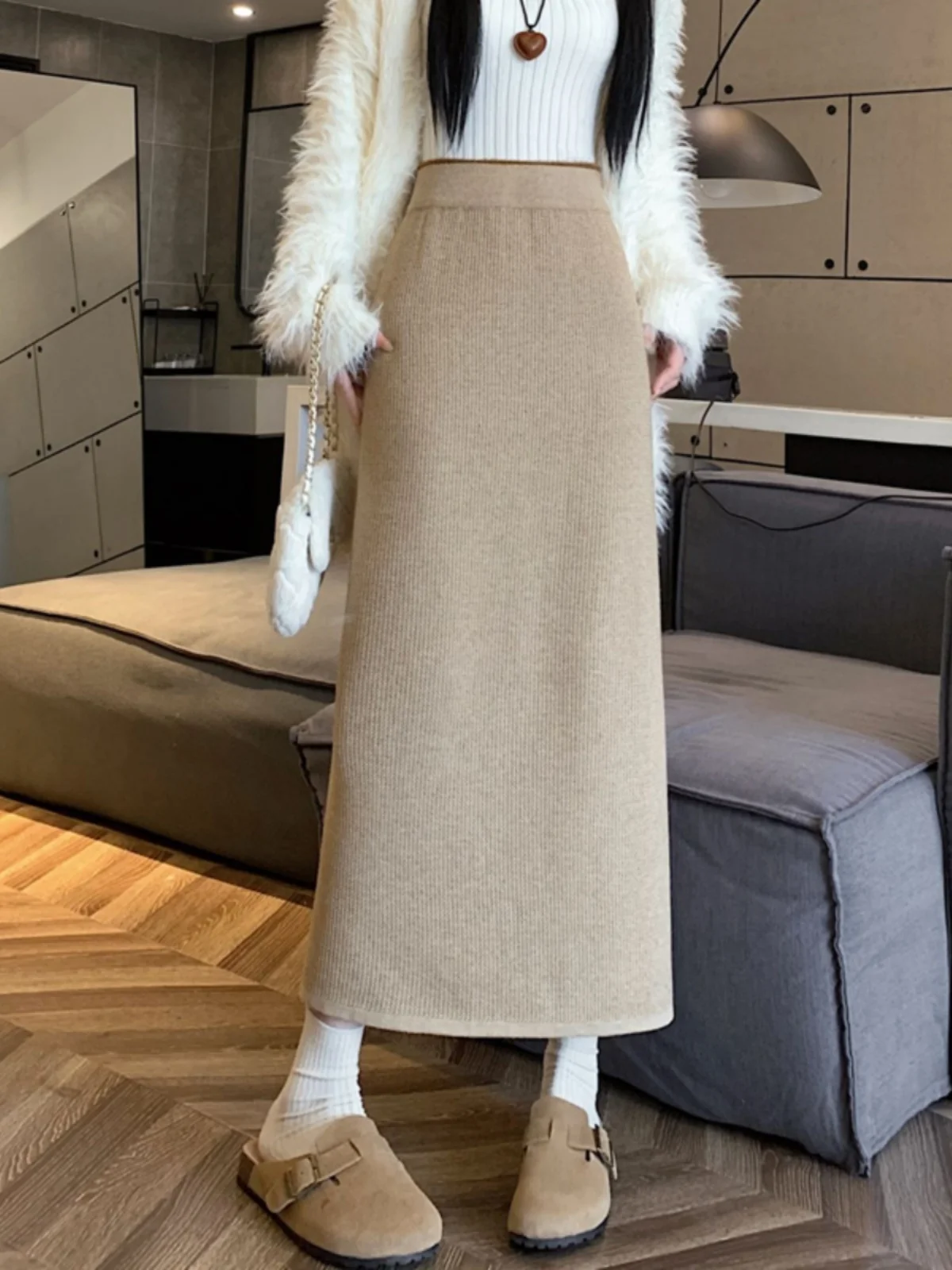 肥厚フリースハイウエストニットハーフスカート女性の秋冬ファッションストレートチューブロングスカート痩身分割デザイン - TopDealBox