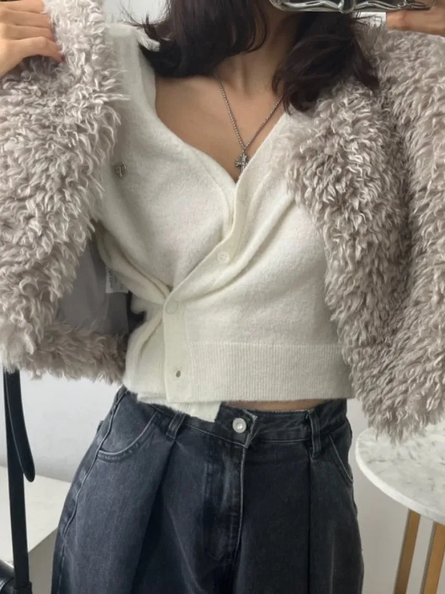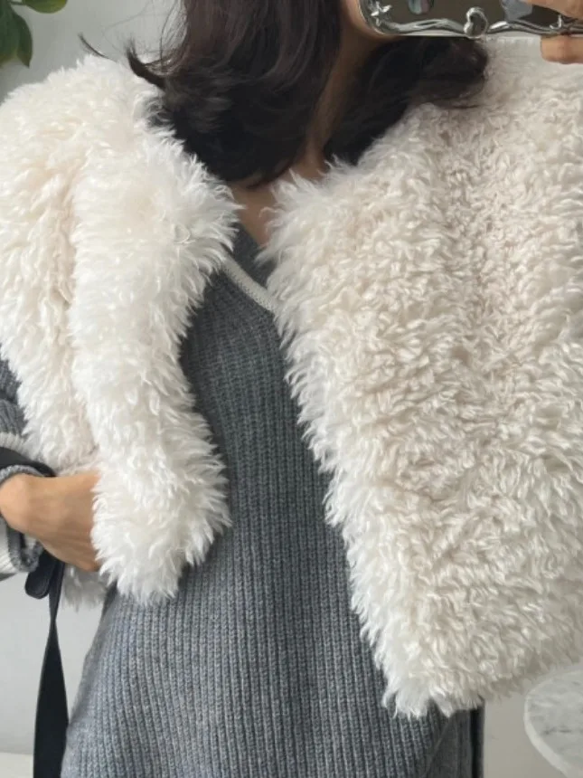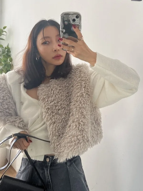 シックな秋冬レトロ多用途スタイリッシュスリムフィットカジュアルラムファーショルダーパッドベスト女性のファッショナブルなオールマッチラウンドネック - TopDealBox