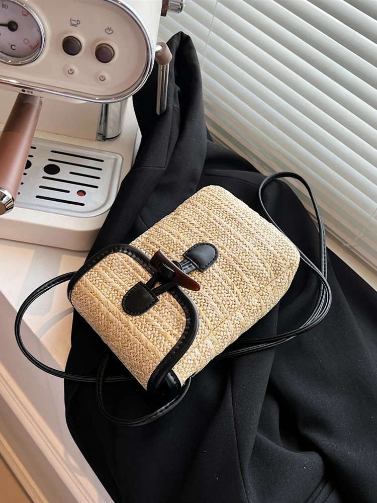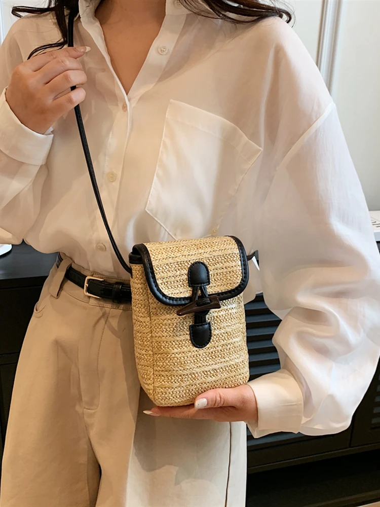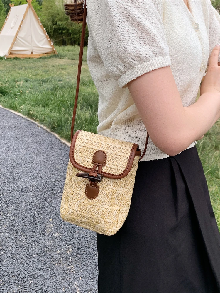 夏カジュアル女性のわら織りミニバッグファッショナブルな多用途シングルショルダークロスボディ電話バッグソフト小型ピュアカラー - TopDealBox