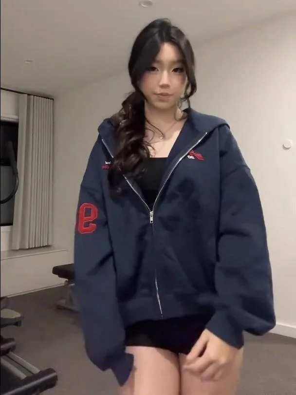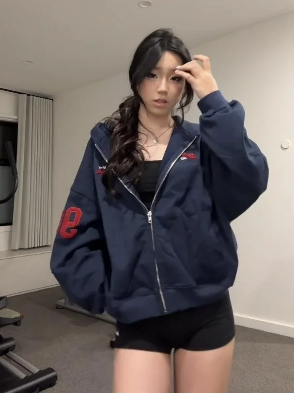 刺繍オーバーサイズフリース裏地パーカーカーディガン女性のルーズフィット長袖コットントレーナーヴィンテージアメリカンスポーツウェア - TopDealBox