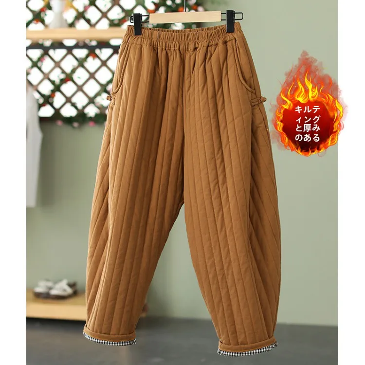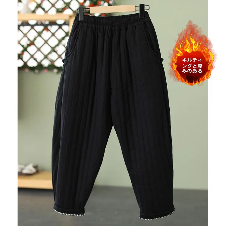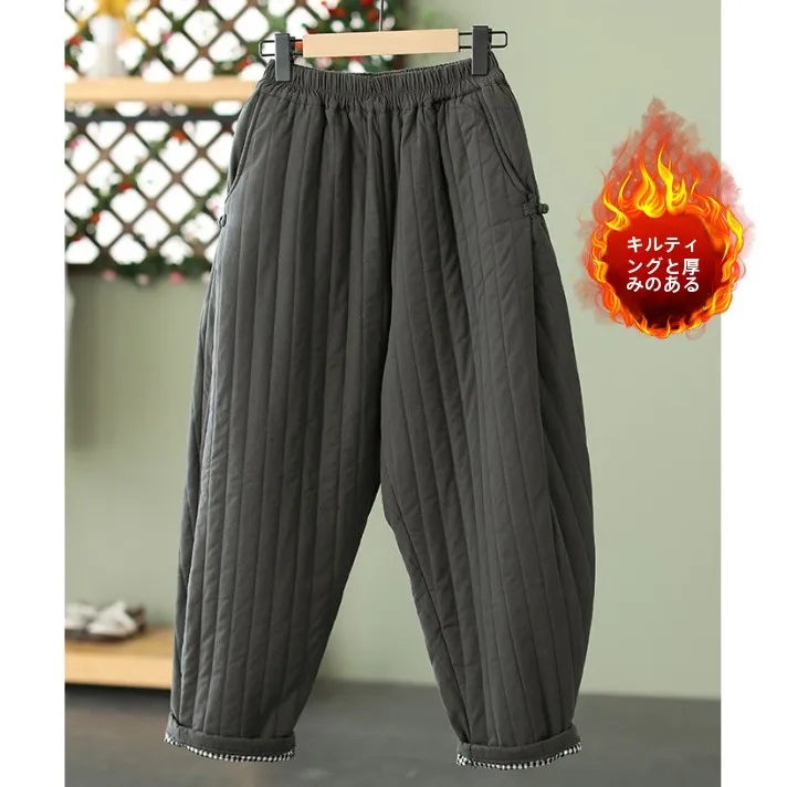レトロボタンアップ肥厚綿パンツハーランスタイルカジュアル冬のアウタープラスサイズの女性ストレートストライプパターン - TopDealBox