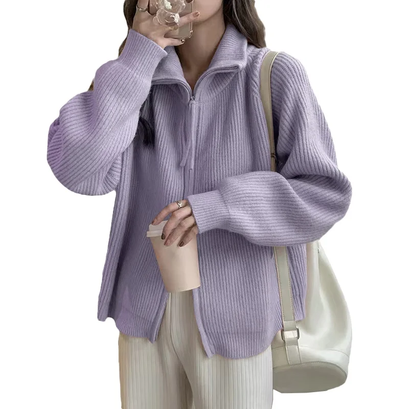 エレガントなパープルニットオープンカーディガンセーター肥厚ジッパー襟女性の春秋の新スタイル快適な長袖トップ - TopDealBox