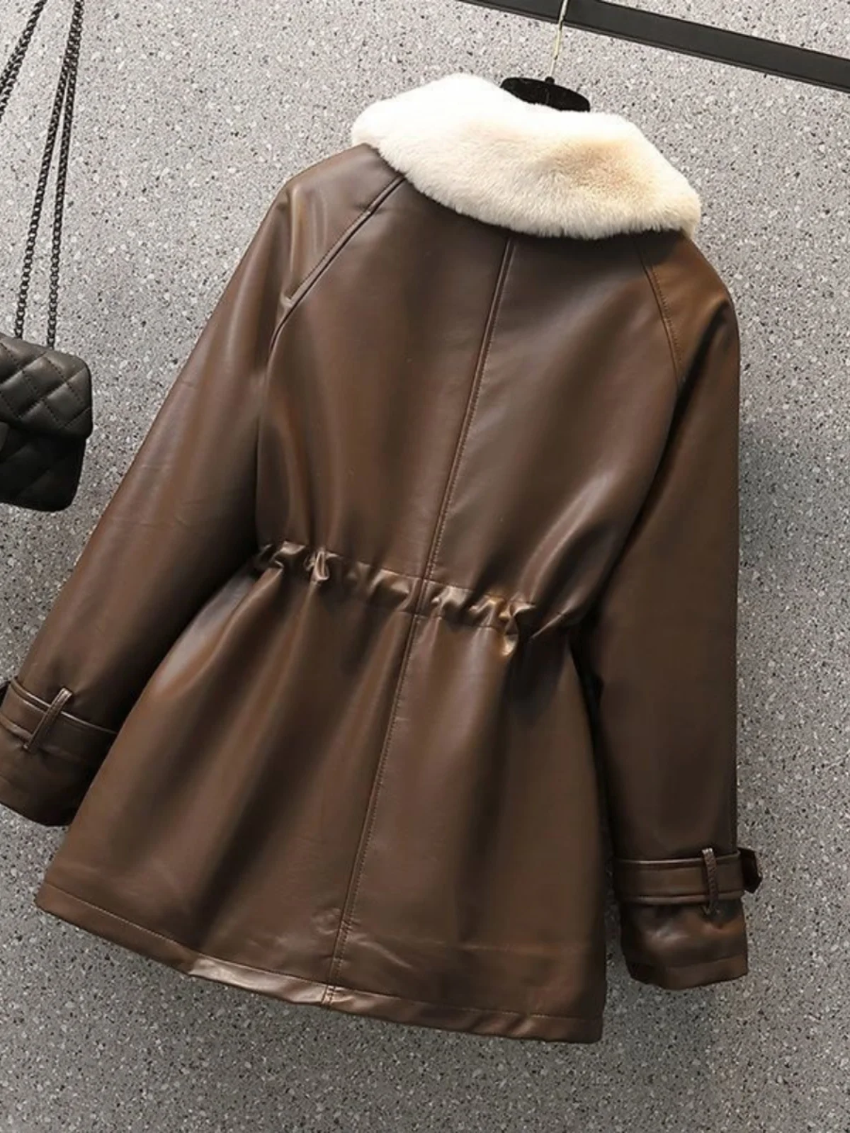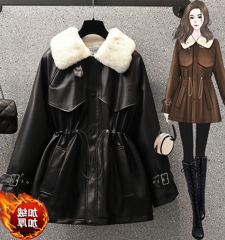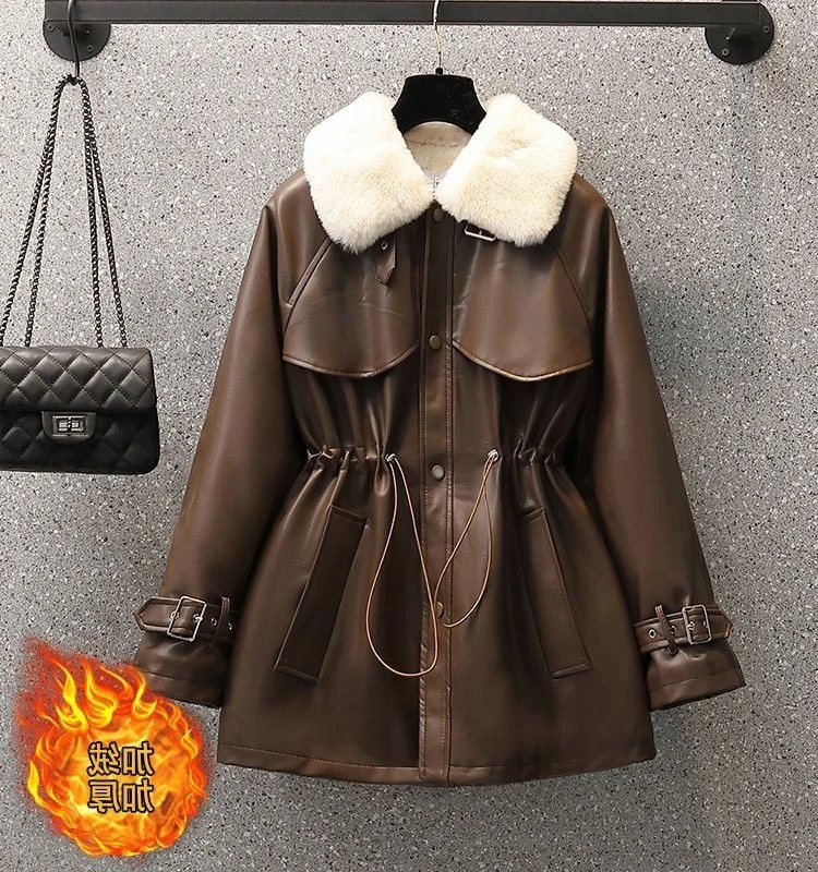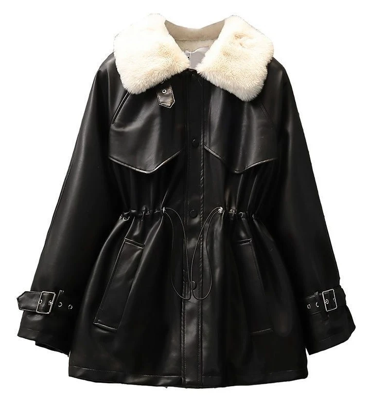 ファッショナブルな冬用レディースバイカージャケット、ファー襟付き、ウエストシェイプデザイン、長袖、ミドル丈、ルーズフィット、レザーコート - TopDealBox