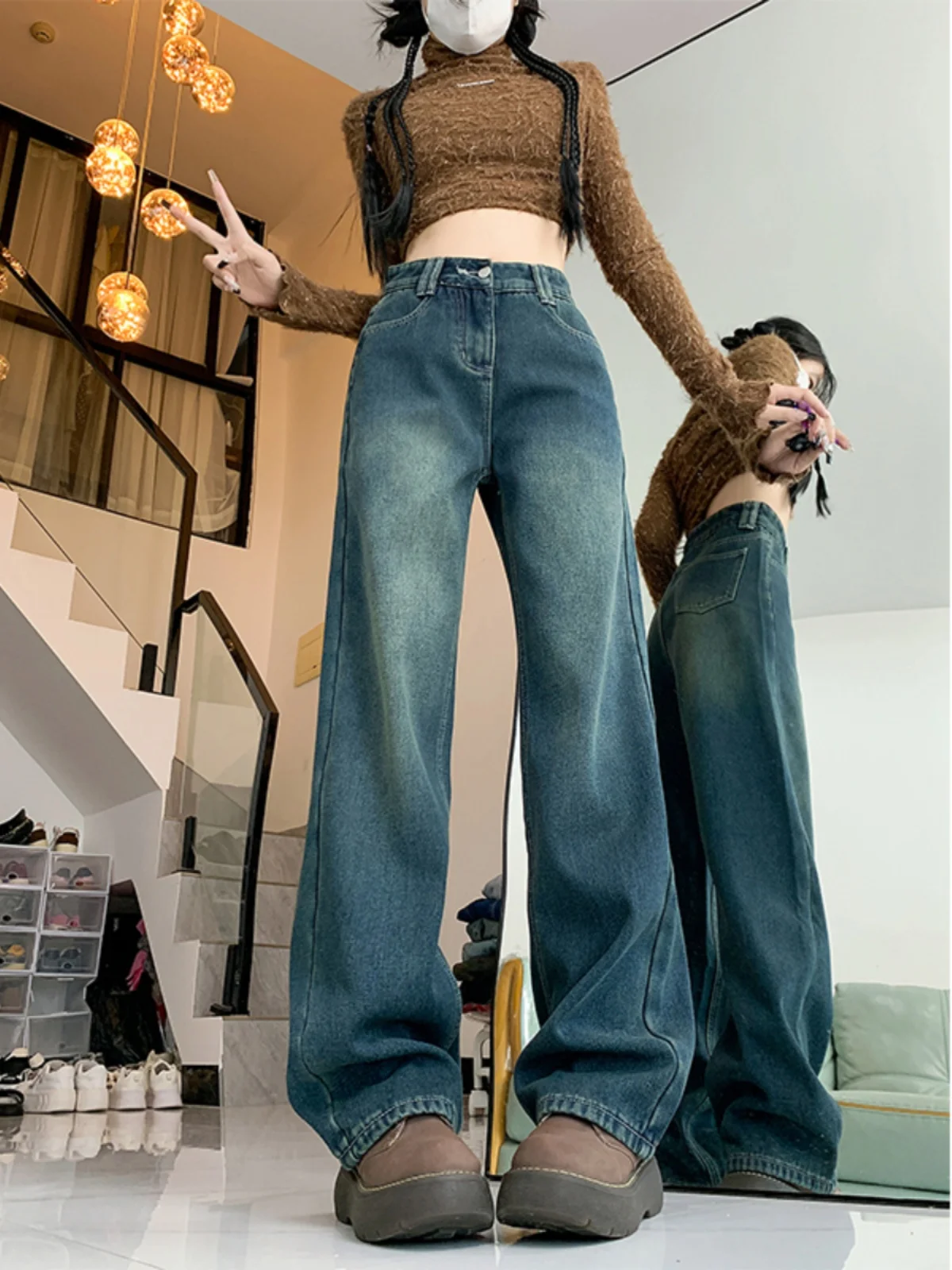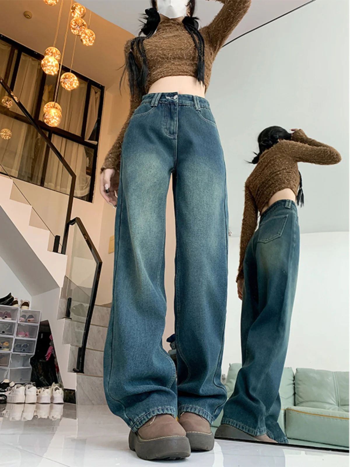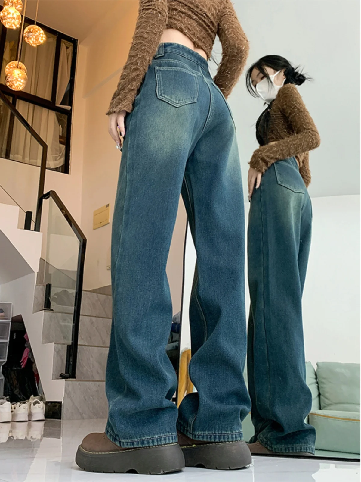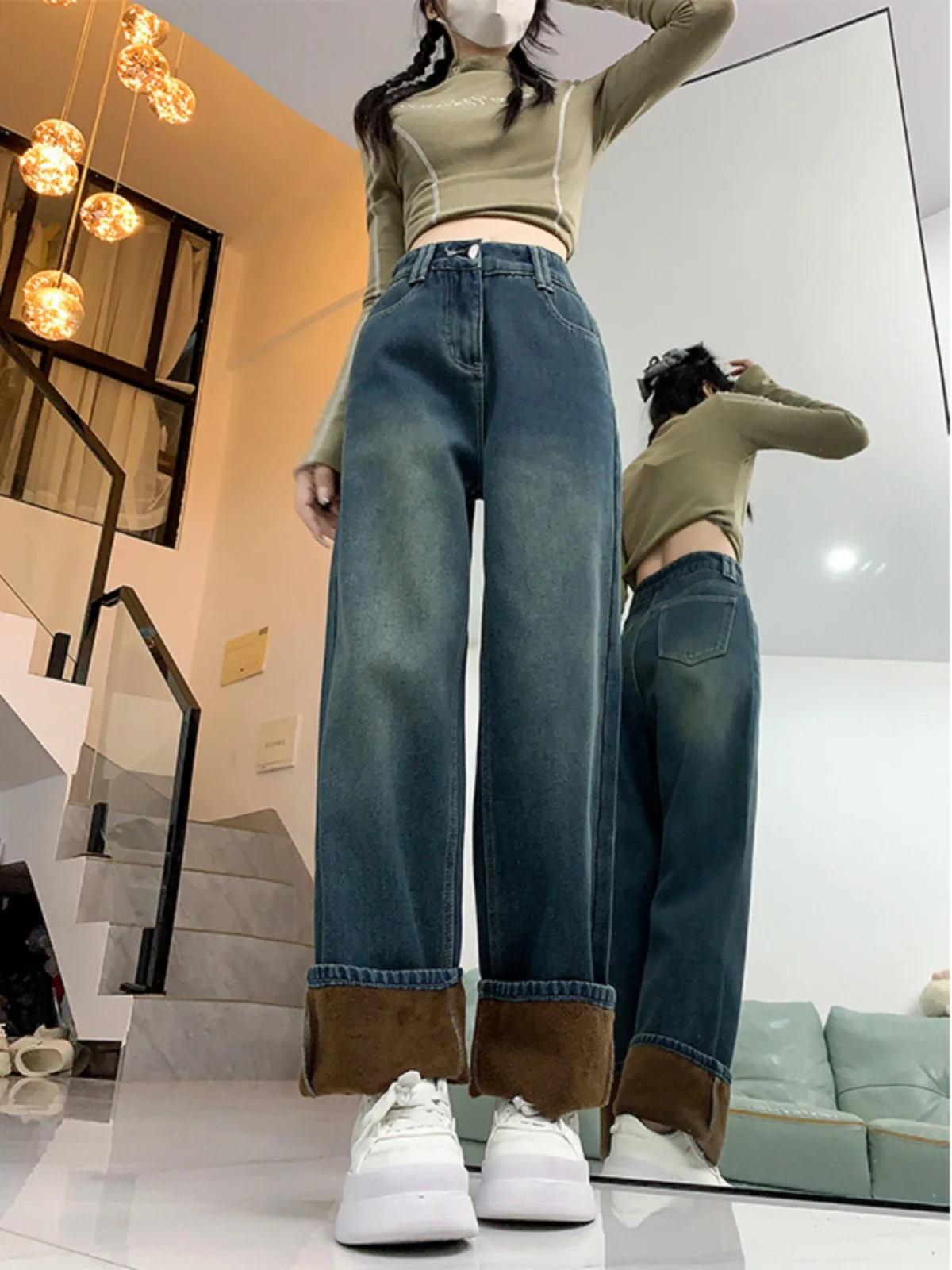 プラスサイズ肥厚フリースデニムパンツ女性ハイウエストワイドレッグストレートカットズボン春の新スタイルカジュアル快適な痩身 - TopDealBox
