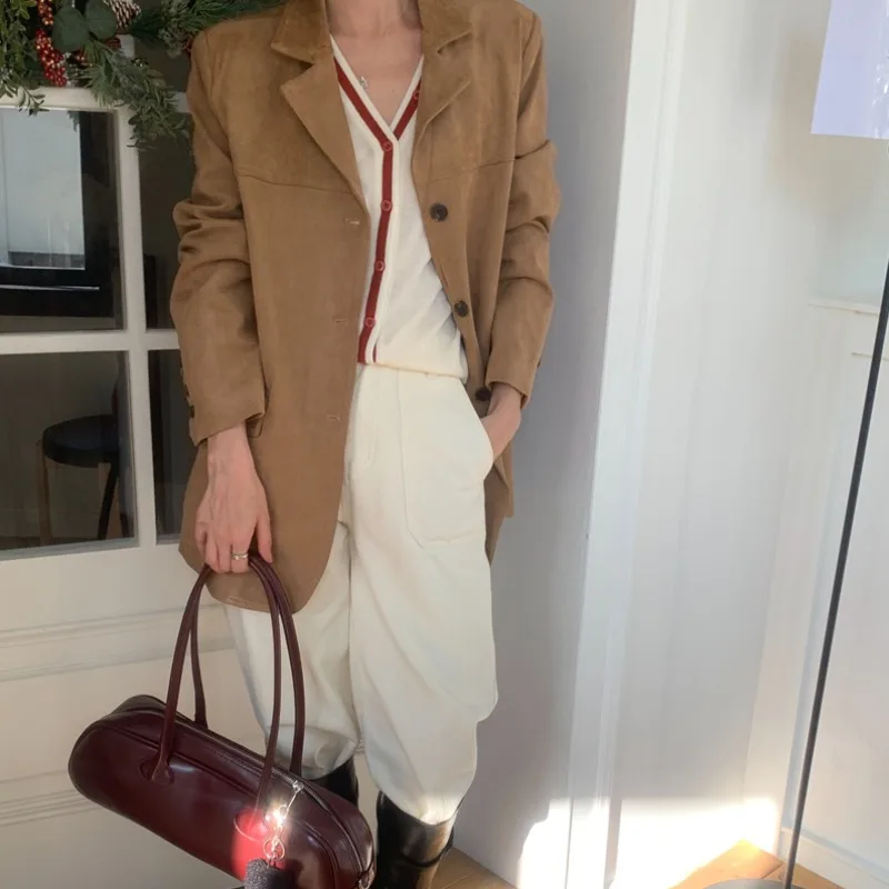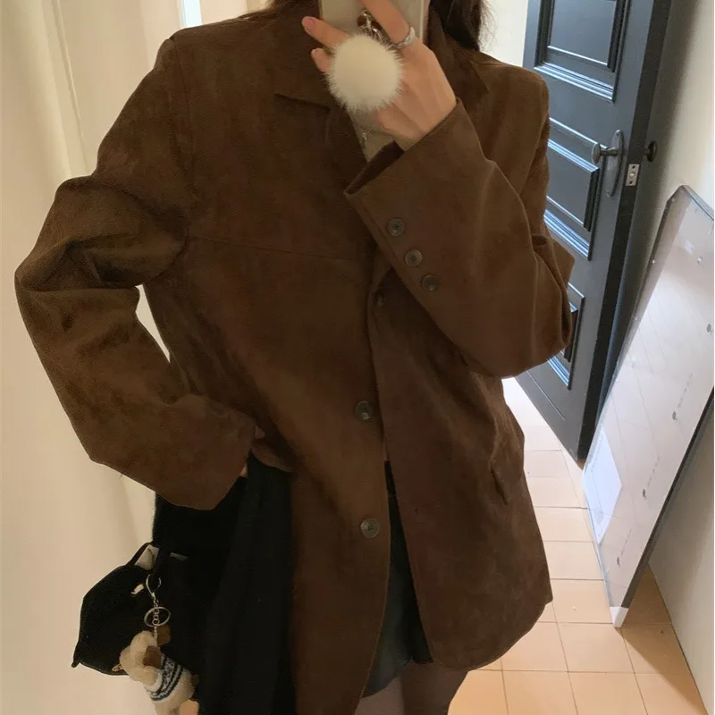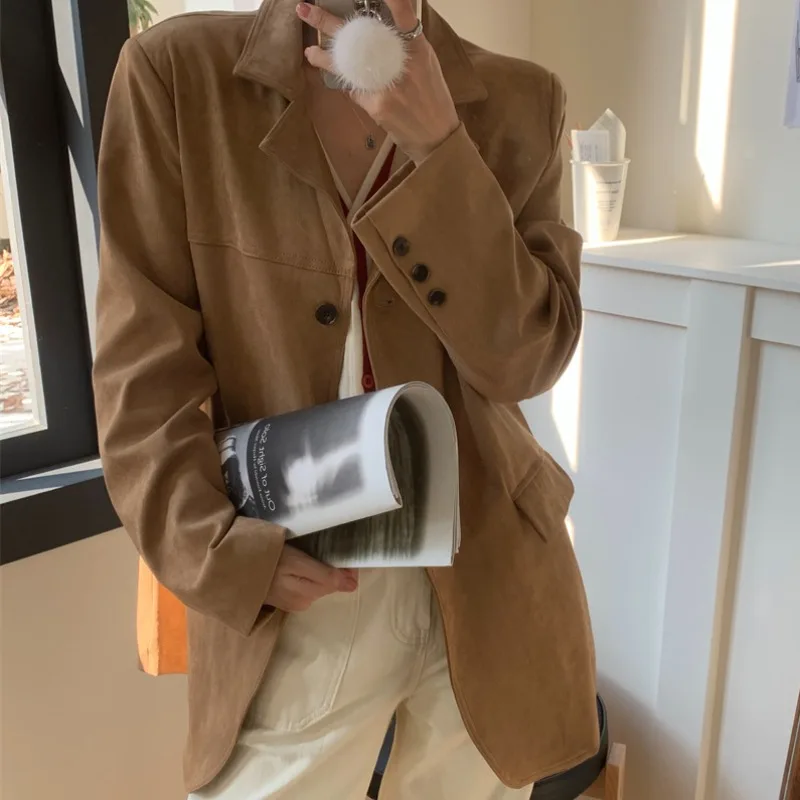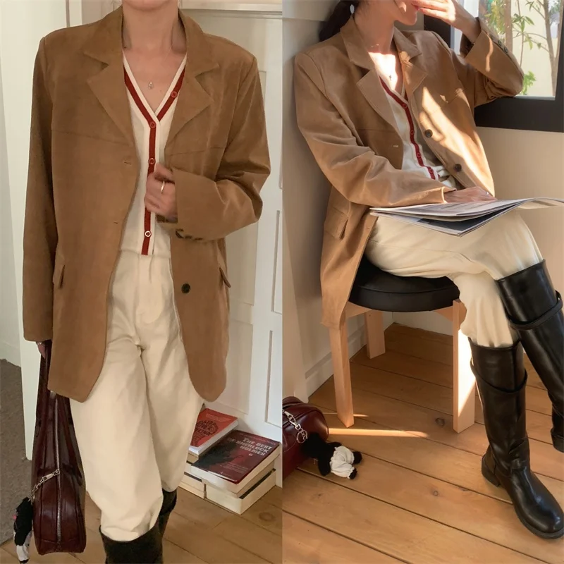 レトロスタイルの女性のルーズカジュアルベルベットスーツジャケット秋冬韓国語版鹿皮ベルベット長袖シングルボタン - TopDealBox
