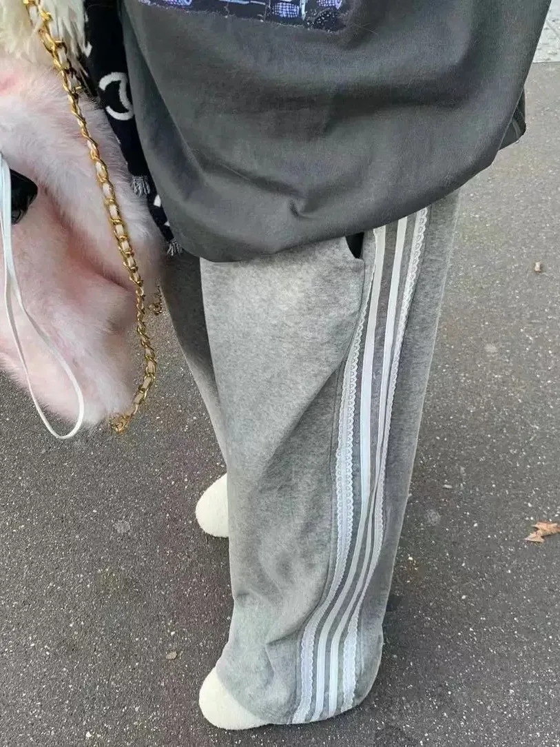 レトロシックなベルベットスポーツパンツ非対称レーストリムサイドニットバンドカジュアルワイドレッグ長ズボン若い女性のための - TopDealBox