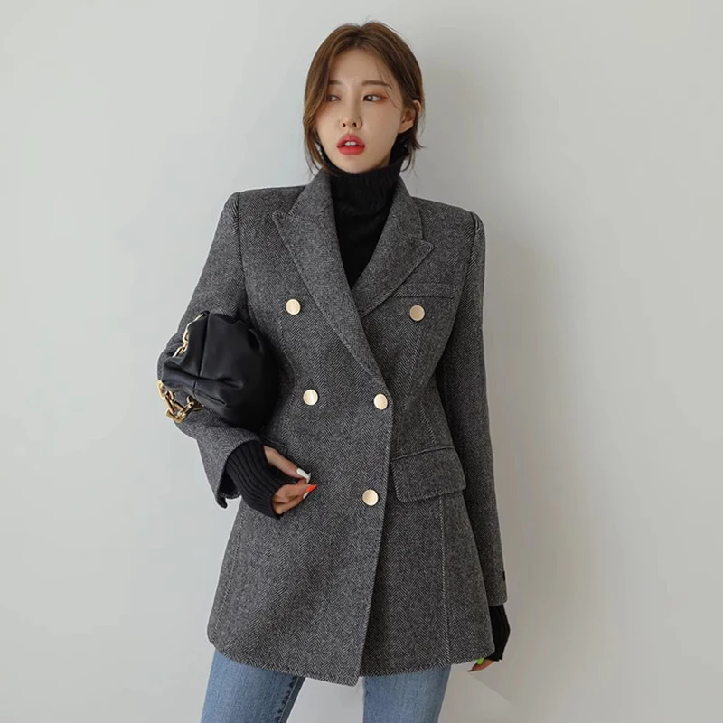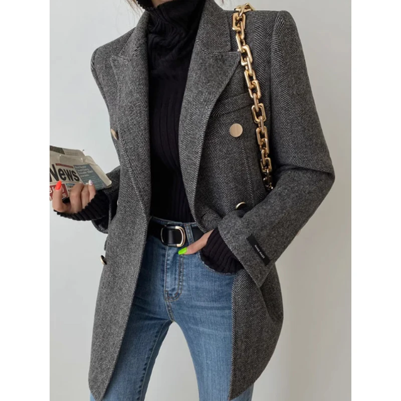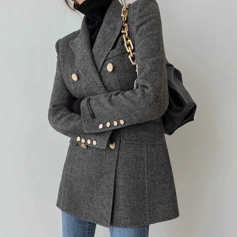 シックな秋冬新スタイルルーズフィット長袖ウールコート女性のファッショナブルなラペルダブルブレストメタルボタンアウター - TopDealBox