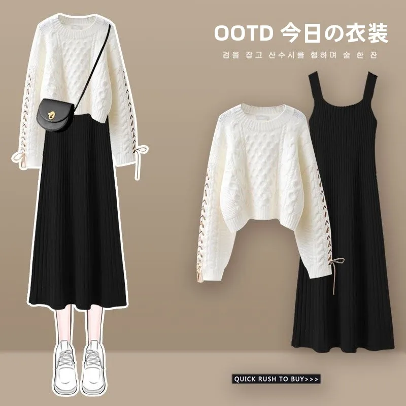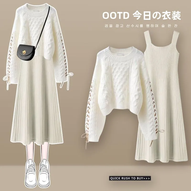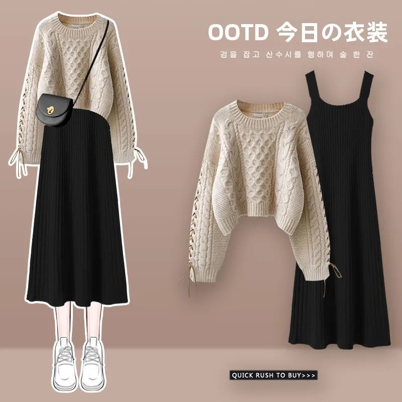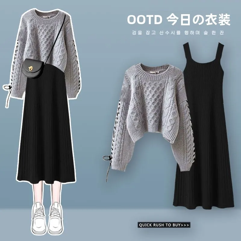 プラスサイズ秋冬ニットセータードレスセット レディースハイエンドファッション スリミングツーピーススーツ 通勤スタイル 長袖ラウンドネック - TopDealBox