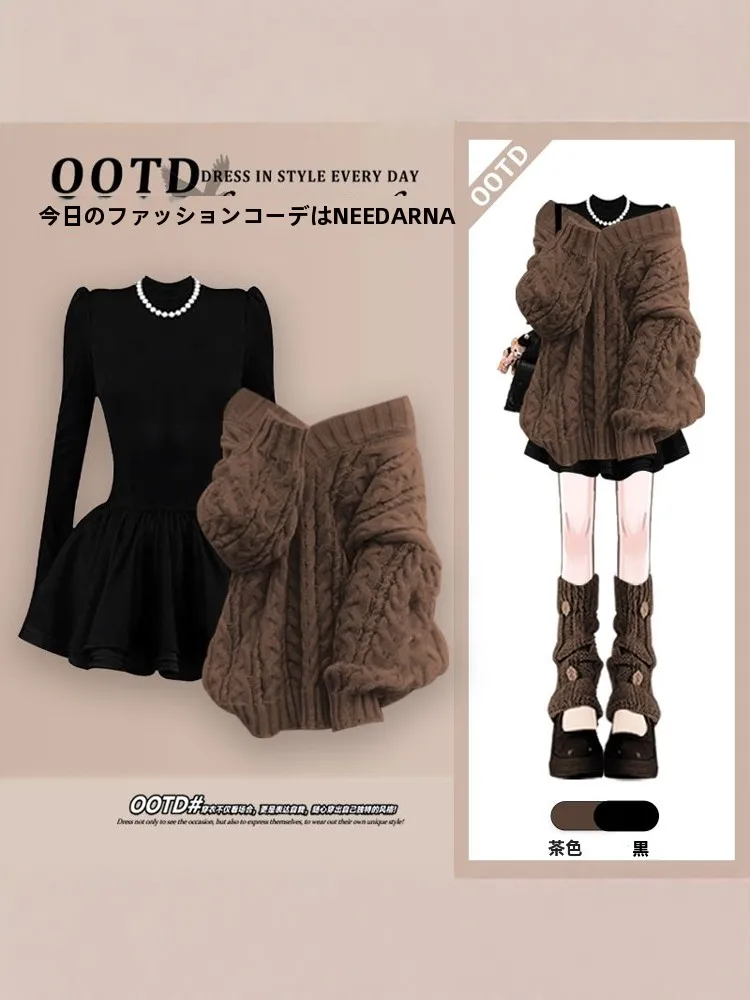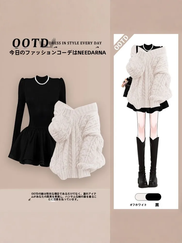 秋冬リッチガールツーピースセットワンショルダーセーターとスリムドレス優しい大人スタイル長袖ポロカラー - TopDealBox