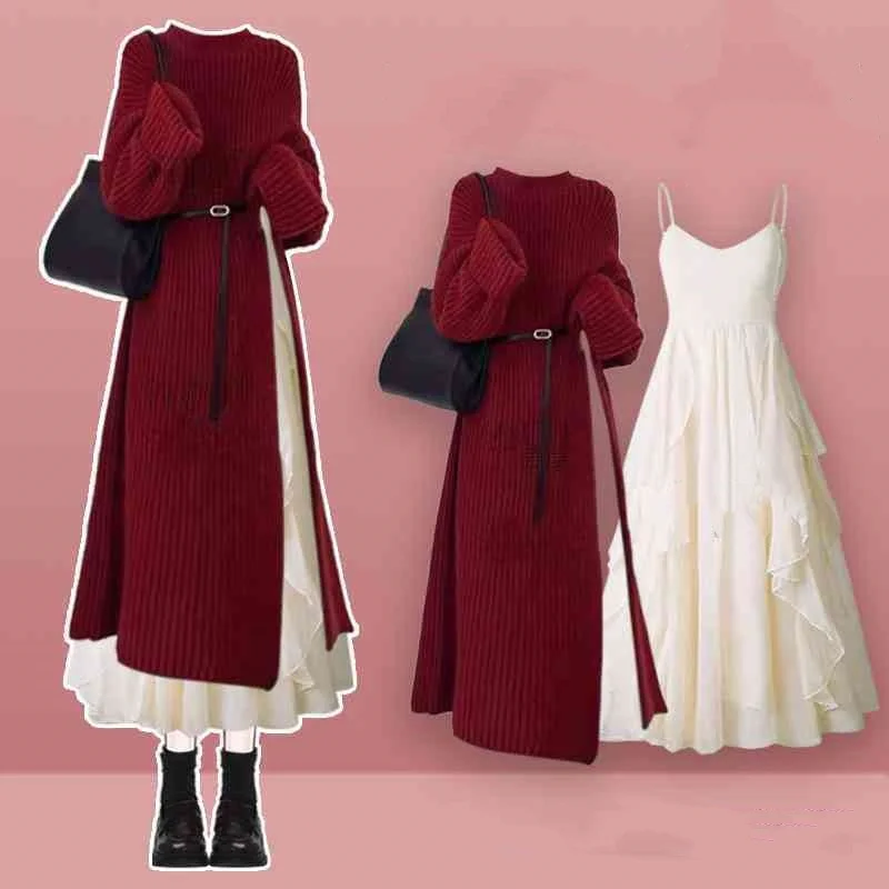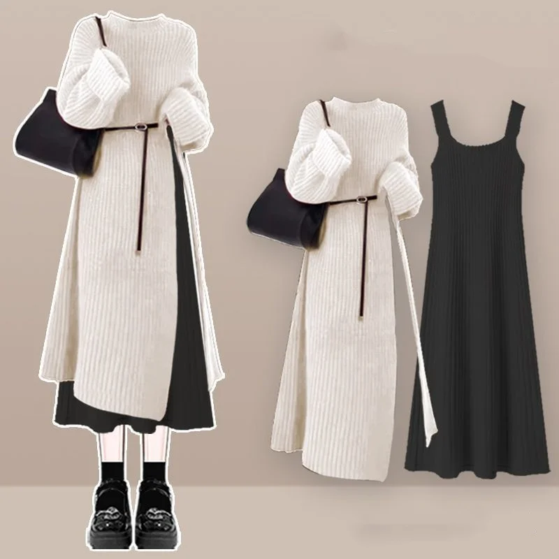 女性の春秋ロングスプリットセータースリングドレスツーピースセットレディグレースフルブラックニット服ノースリーブドレス衣装 - TopDealBox