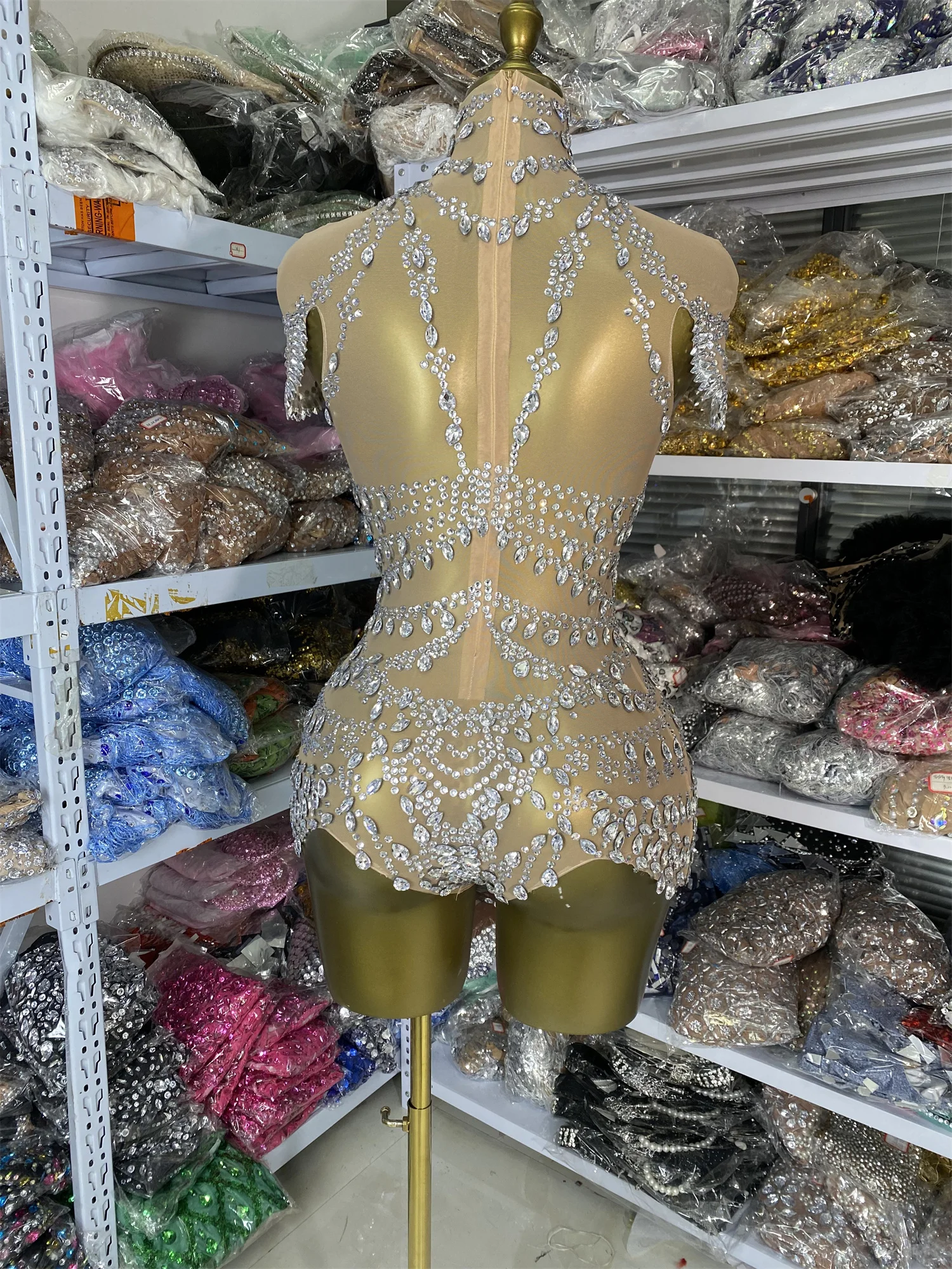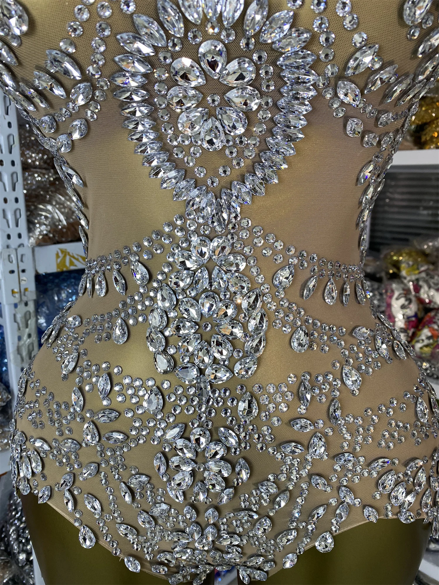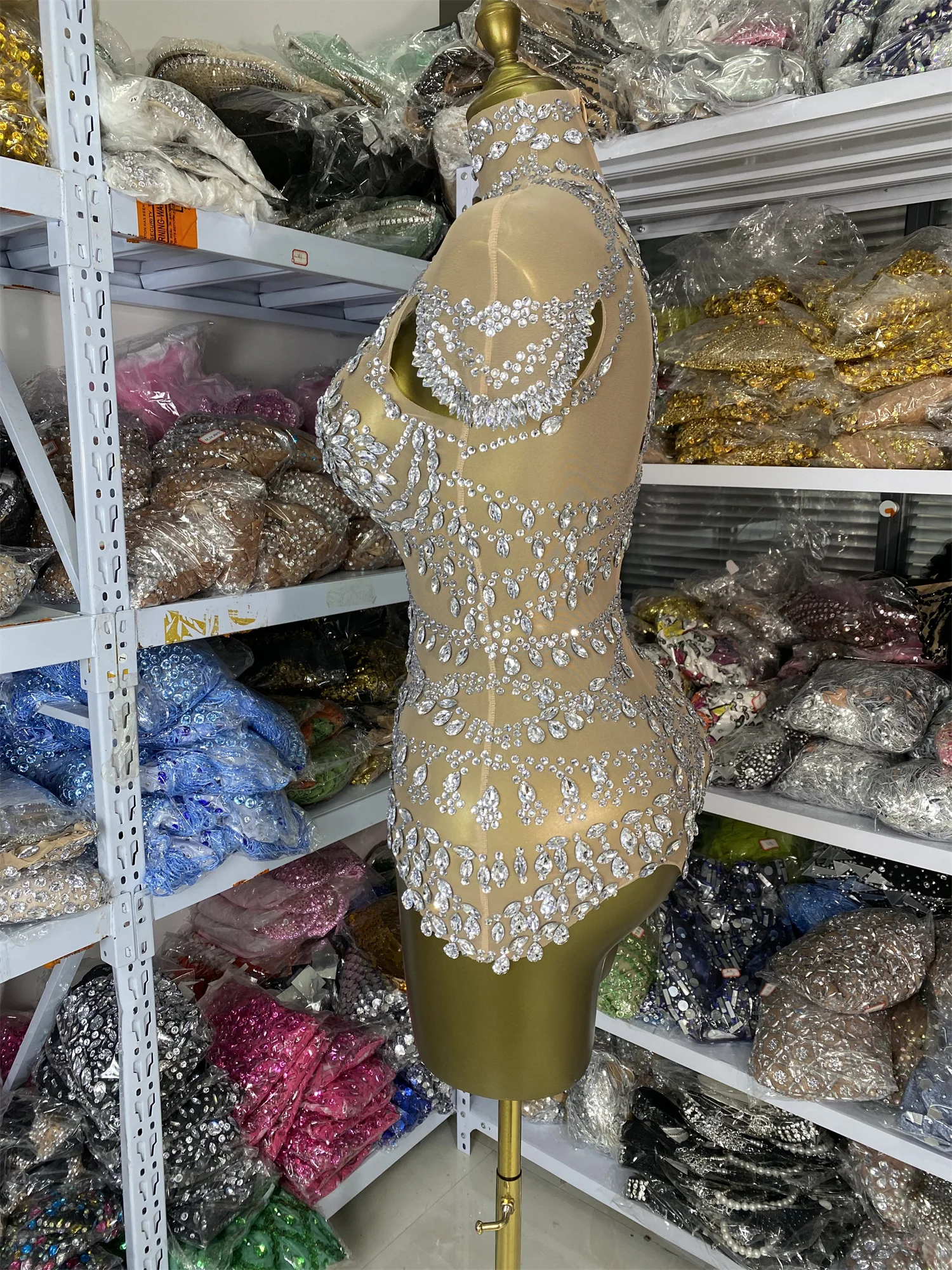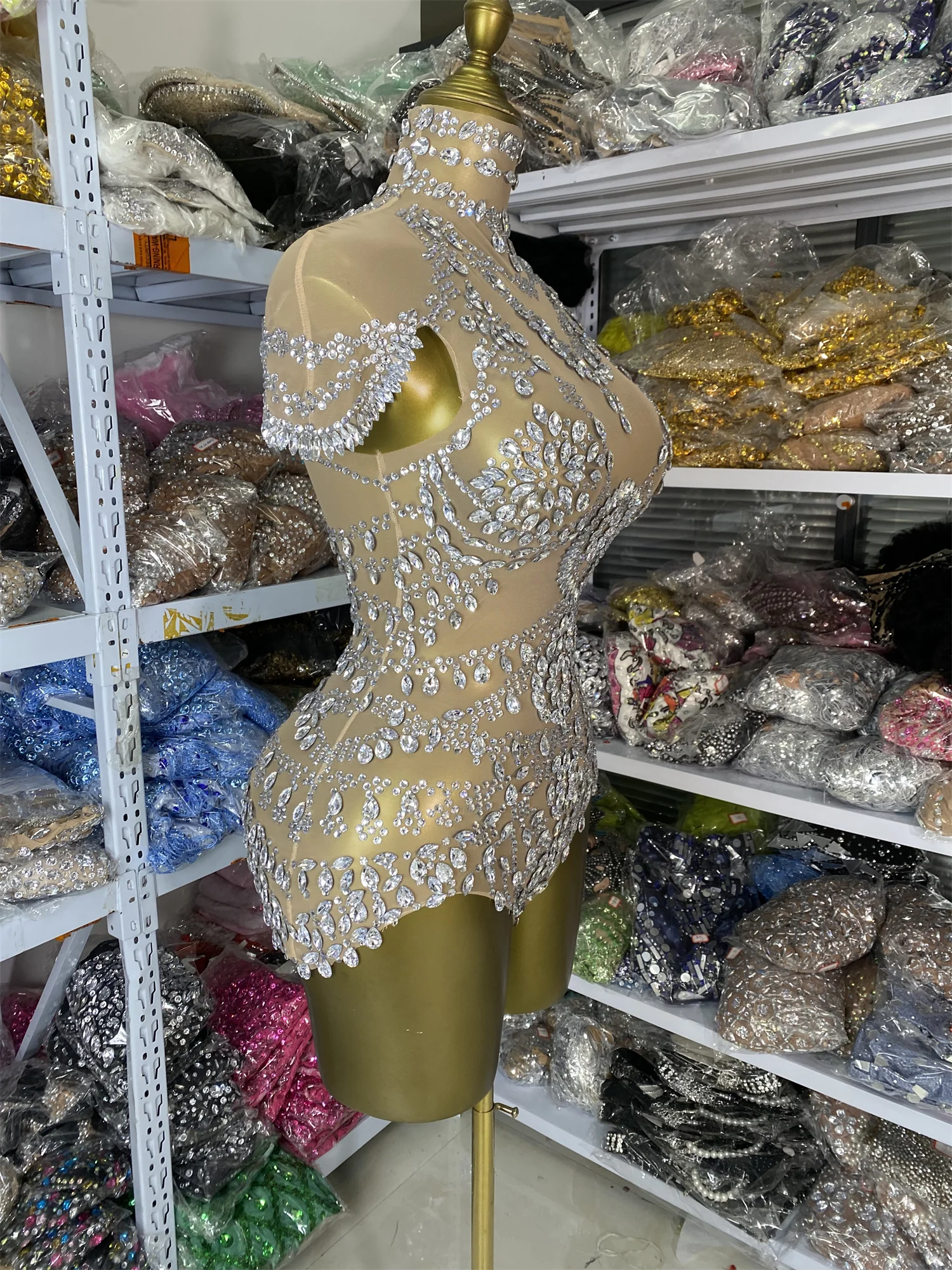 女性明るいラインストーンボディスーツイブニングクラブ半袖タートルネック遊び着ショーガールステージ衣装特別な日のドレス - TopDealBox