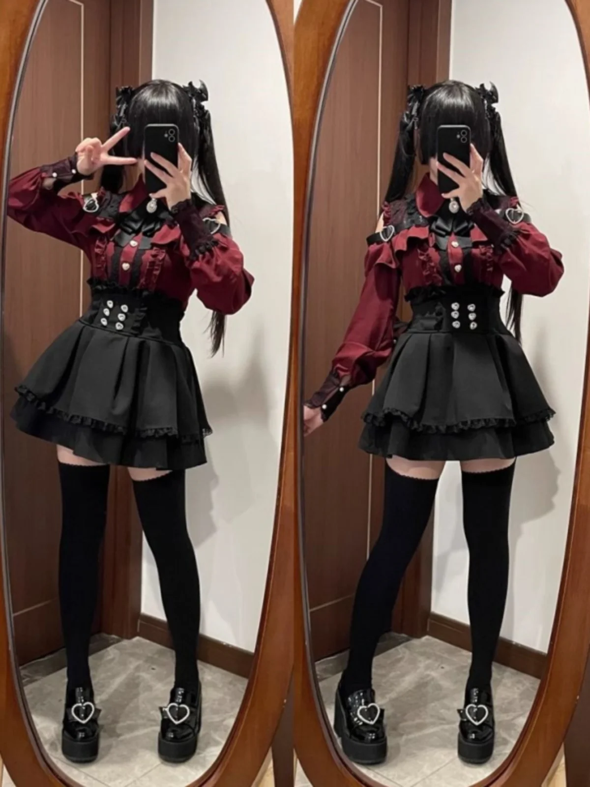 ♡Quick viewダークロマンティックショルダーバードシャツとハーフスカートセット 春秋 日本風スクールユニフォームスタイル ツーピースセット ティーンガールズ向け1506 JPYHot★★★★★4.5