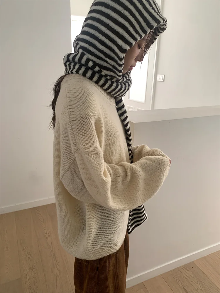 暖かいストライプ帽子スカーフ一体型ネックウォーマー女性の自転車乗馬冬のファッション韓国スタイル防風スカーフ帽子コンボ