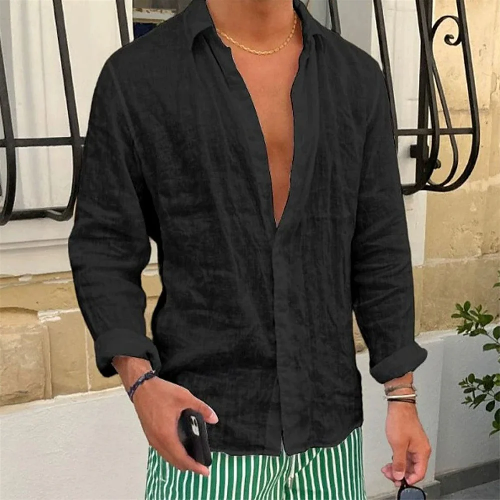 春秋メンズコットンリネンシャツカジュアル長袖無地スリムフィットラペルベーシックスタイル通気性ボタントップス