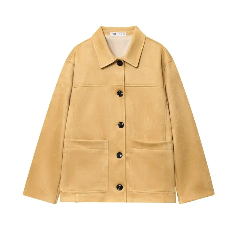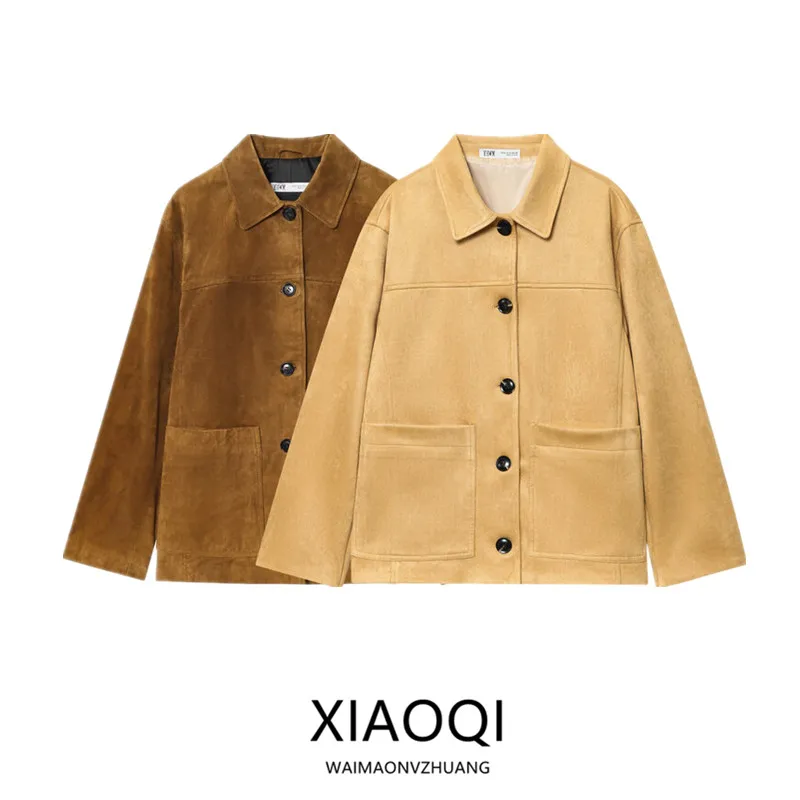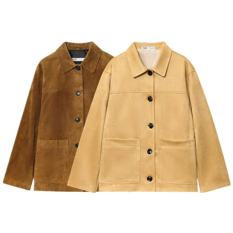 レディースルーズロングスリーブフェイクレザージャケット秋の新作万能アウター暖かファッションスタイルボタン留め - TopDealBox