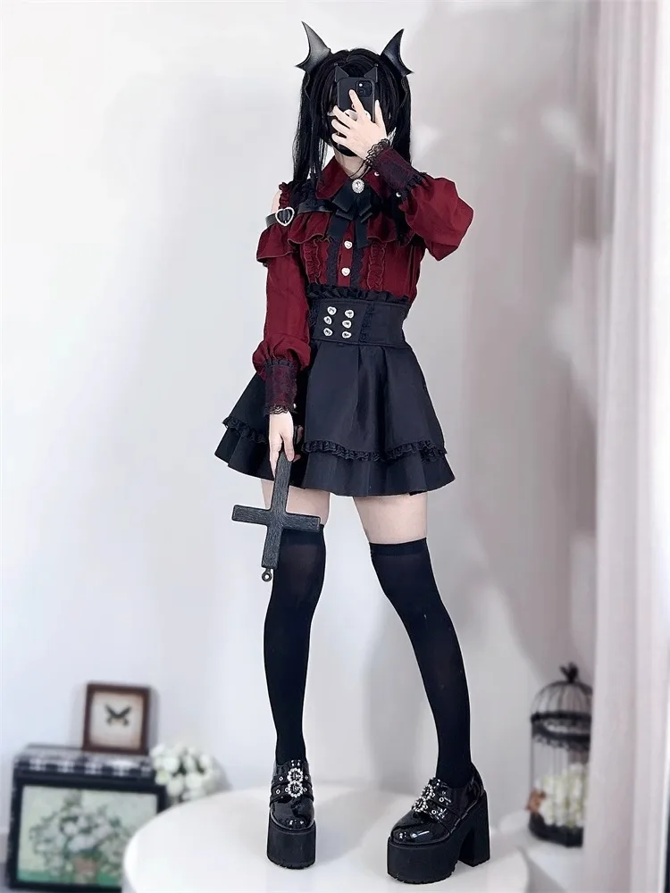 ヤミカワイイツーピースセット - レースブラウス&ミニスカートコーデ、セクシーゴシックロリータクロップトップ(取り外し可能な袖付き)小柄な女の子向け - TopDealBox
