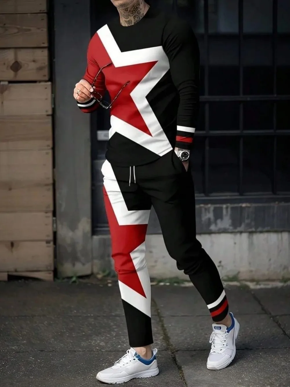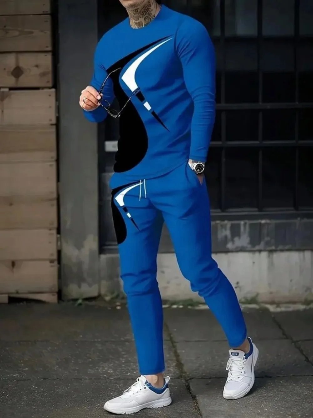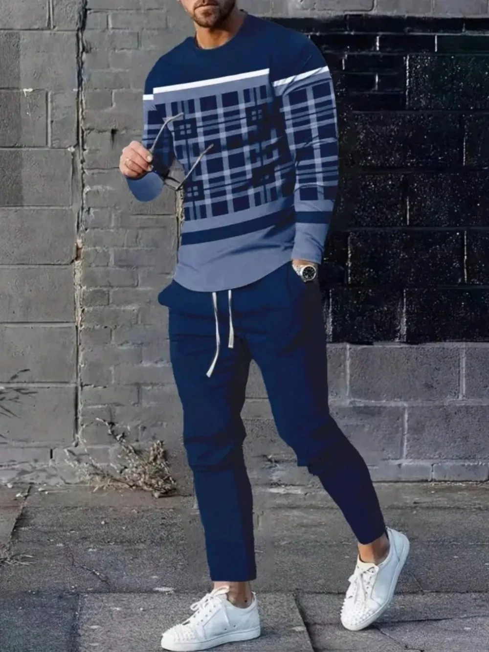 おしゃれな夏のメンズストライプパッチワークプリント通気性ラウンドネック長袖パンツセットアウトドアカジュアルウェア - TopDealBox
