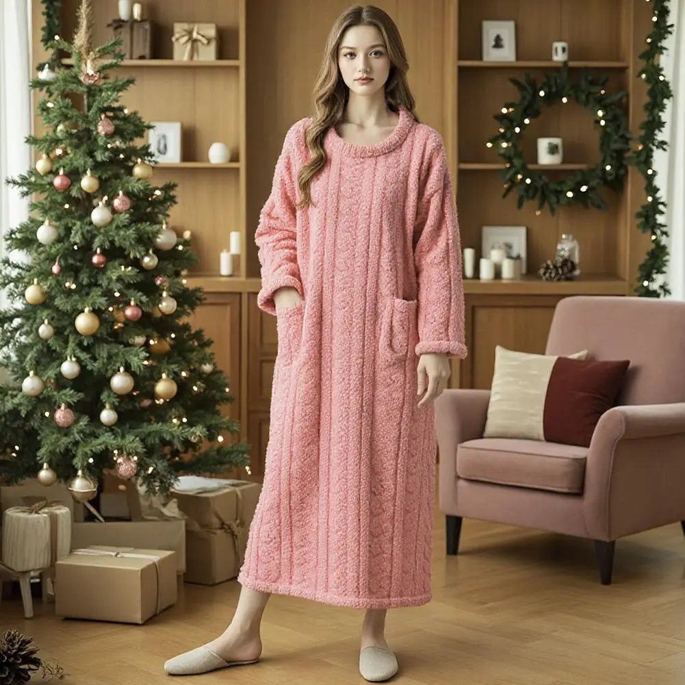 冬用長袖ダブルポケットフランネルナイトガウン レディース ゆったり無地スリープウェア ジャカードナイトドレス 厚手暖かいナイトドレス - TopDealBox