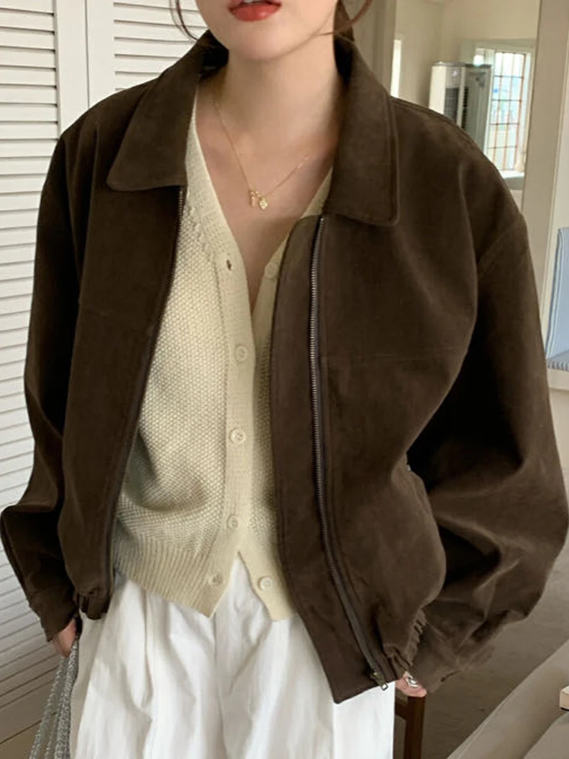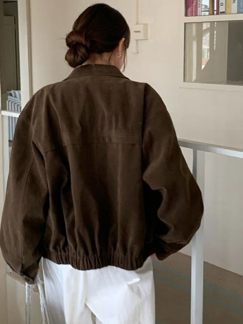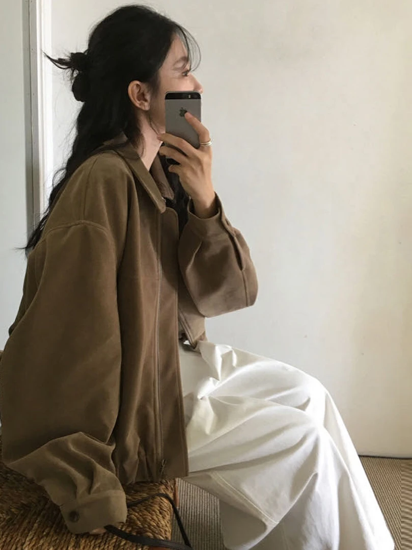 レトロショートレザーベルベットジャケット女性のファッションジッパー長袖トップアウター韓国スタイルルーズフィット秋新着 - TopDealBox