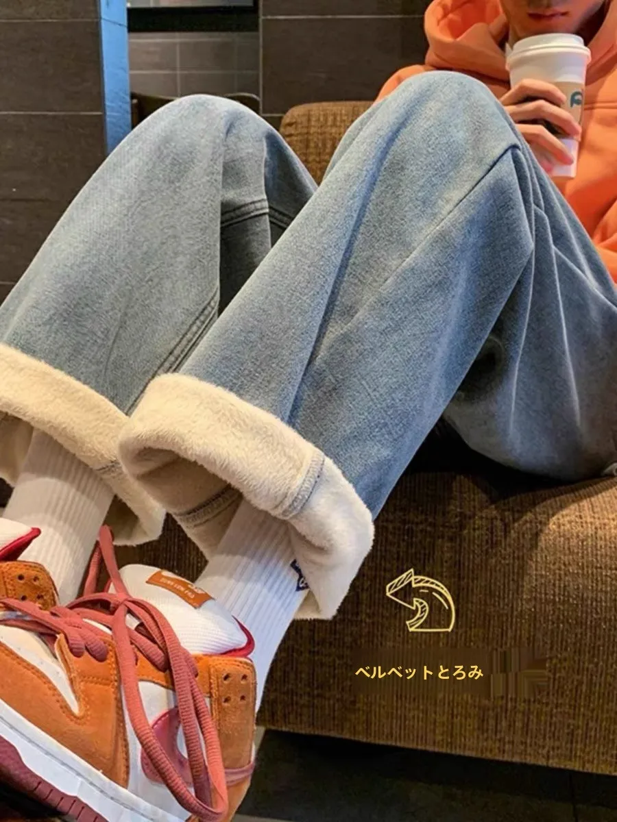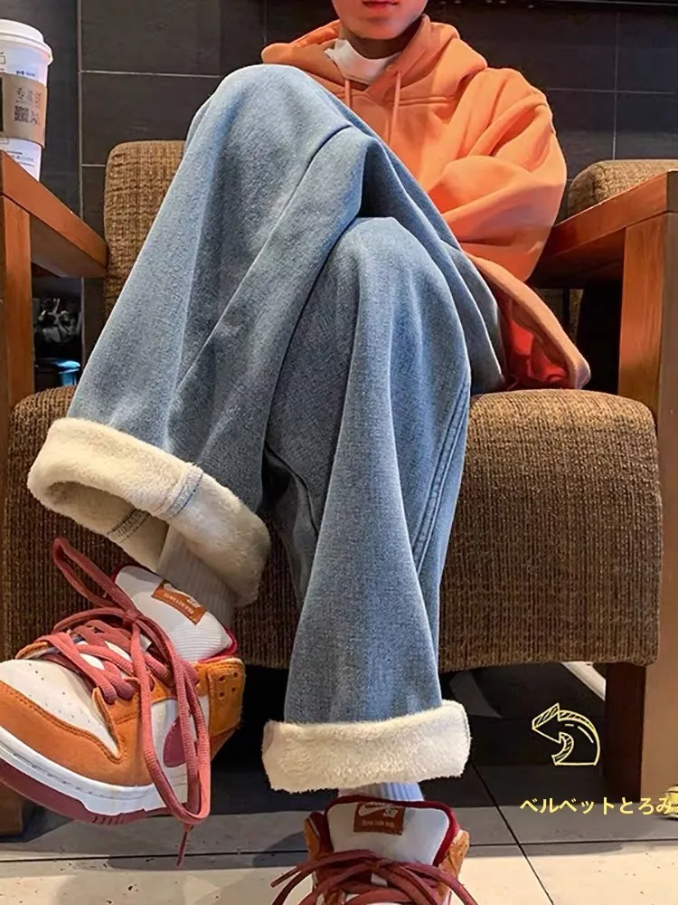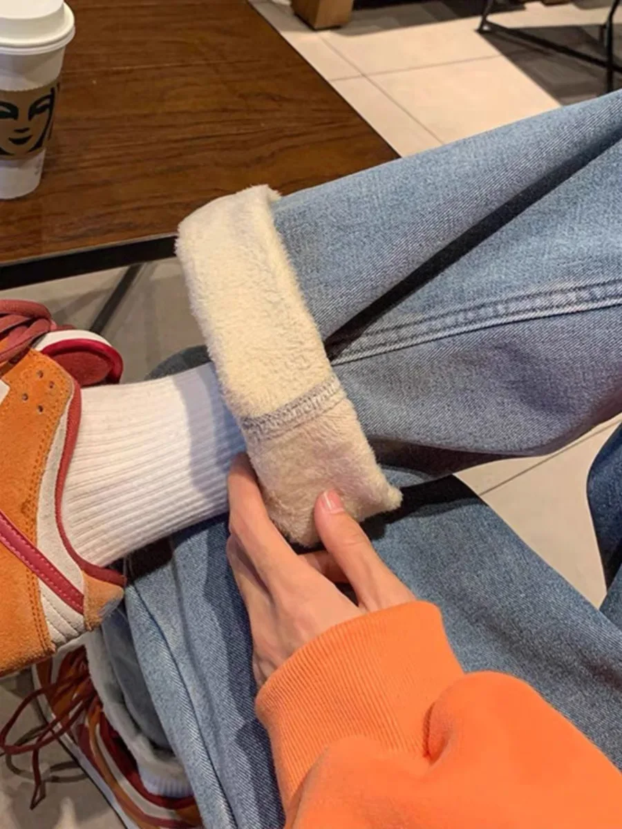 厚みのあるフリース裏地ストレートレッグジーンズ女性の冬ルーズハイストリートトレンディブランドオーバーサイズデニムパンツカジュアルスタイル - TopDealBox