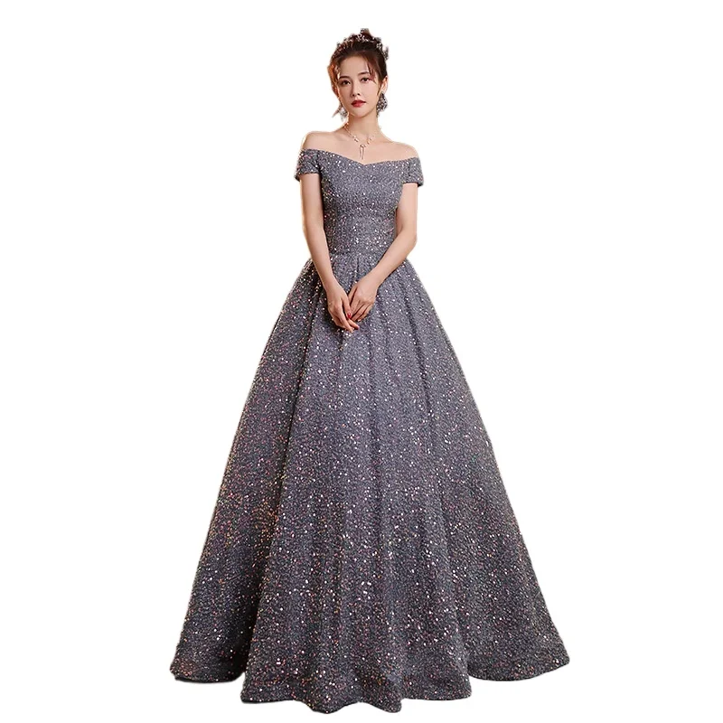 ワンショルダー学生声楽演奏ドレス、ソロ演奏ドレス、パフスカート、ロング星空ドレスウェディングドレス - TopDealBox