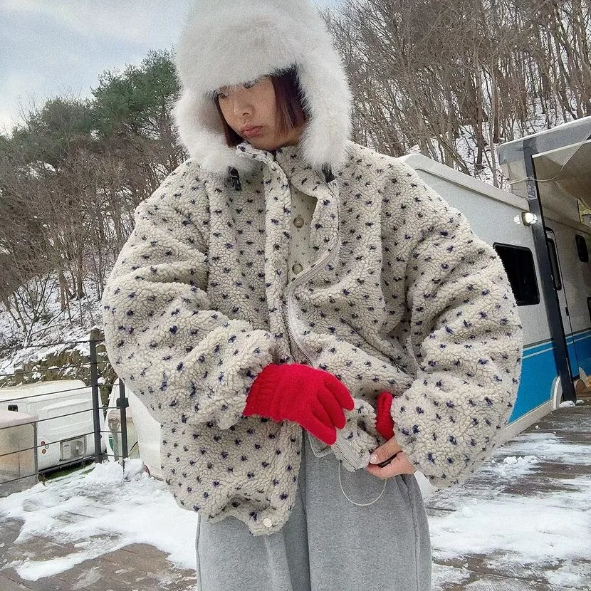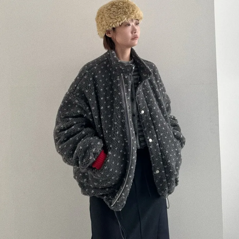 シックな韓国スタイルのハート柄ラムファーコットンジャケット女性のカジュアルコート長袖ジッパー開閉フード付き冬アウター - TopDealBox