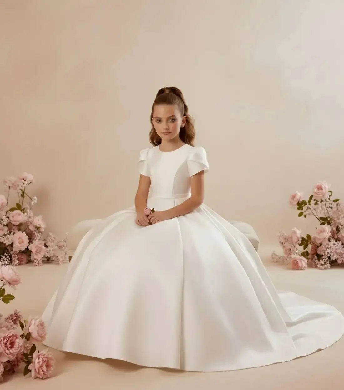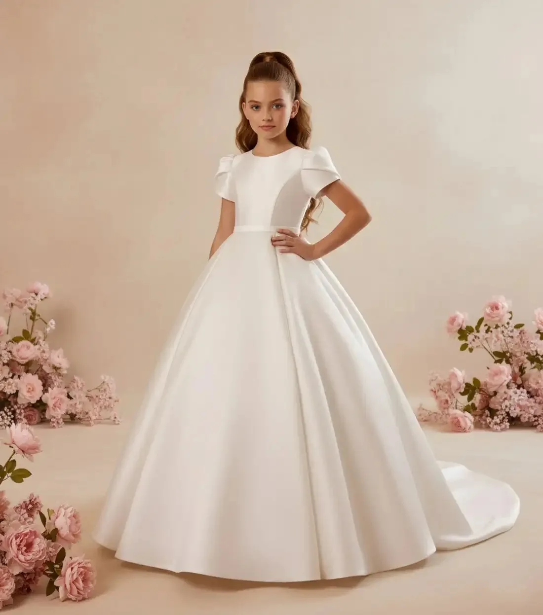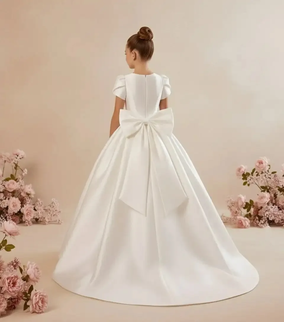 カスタマイズされた白いフラワーガールドレス結婚式用リボン付きサテンフロアレングスエレガントな初聖体拝領ボール誕生日パーティードレス - TopDealBox
