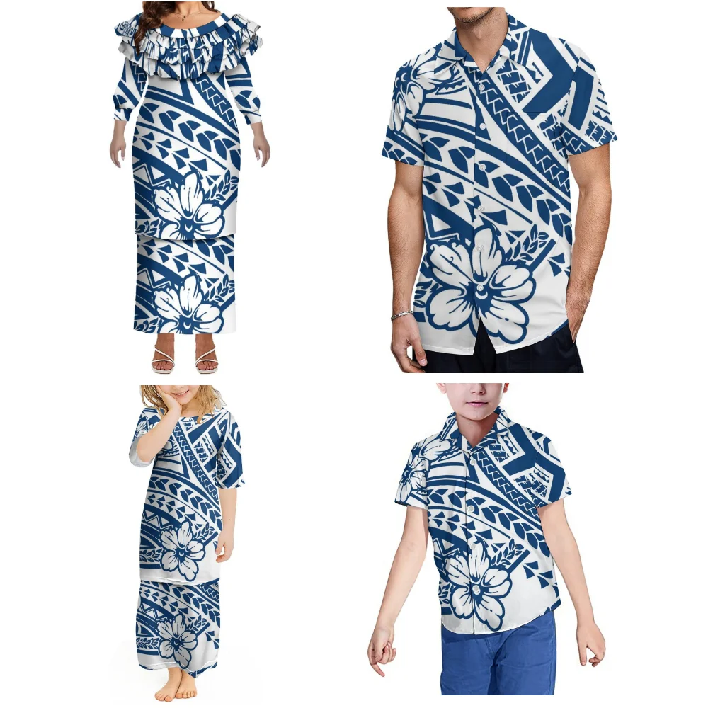 ロング丈のプネタシスーツドレス、蓮の葉のレース襟とランタンスリーブ付き、カスタムメイドのポリネシア女性用ドレス - TopDealBox