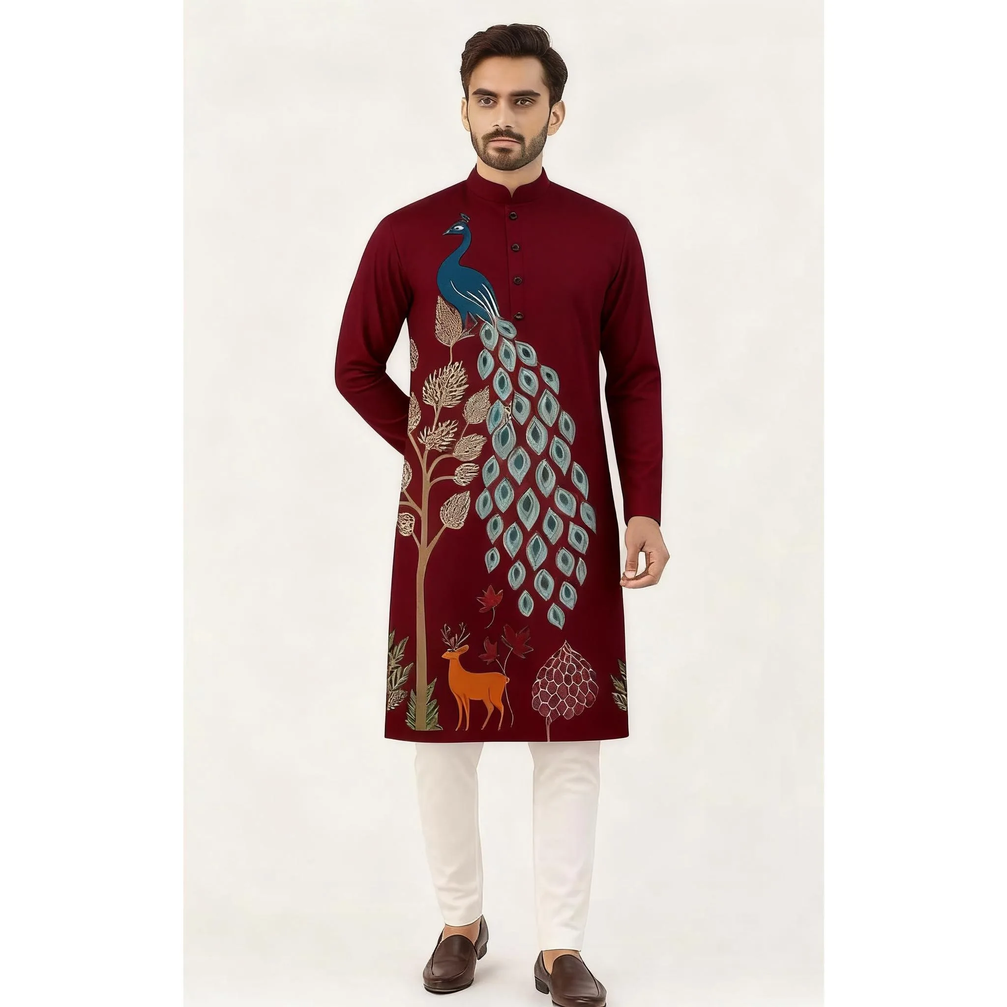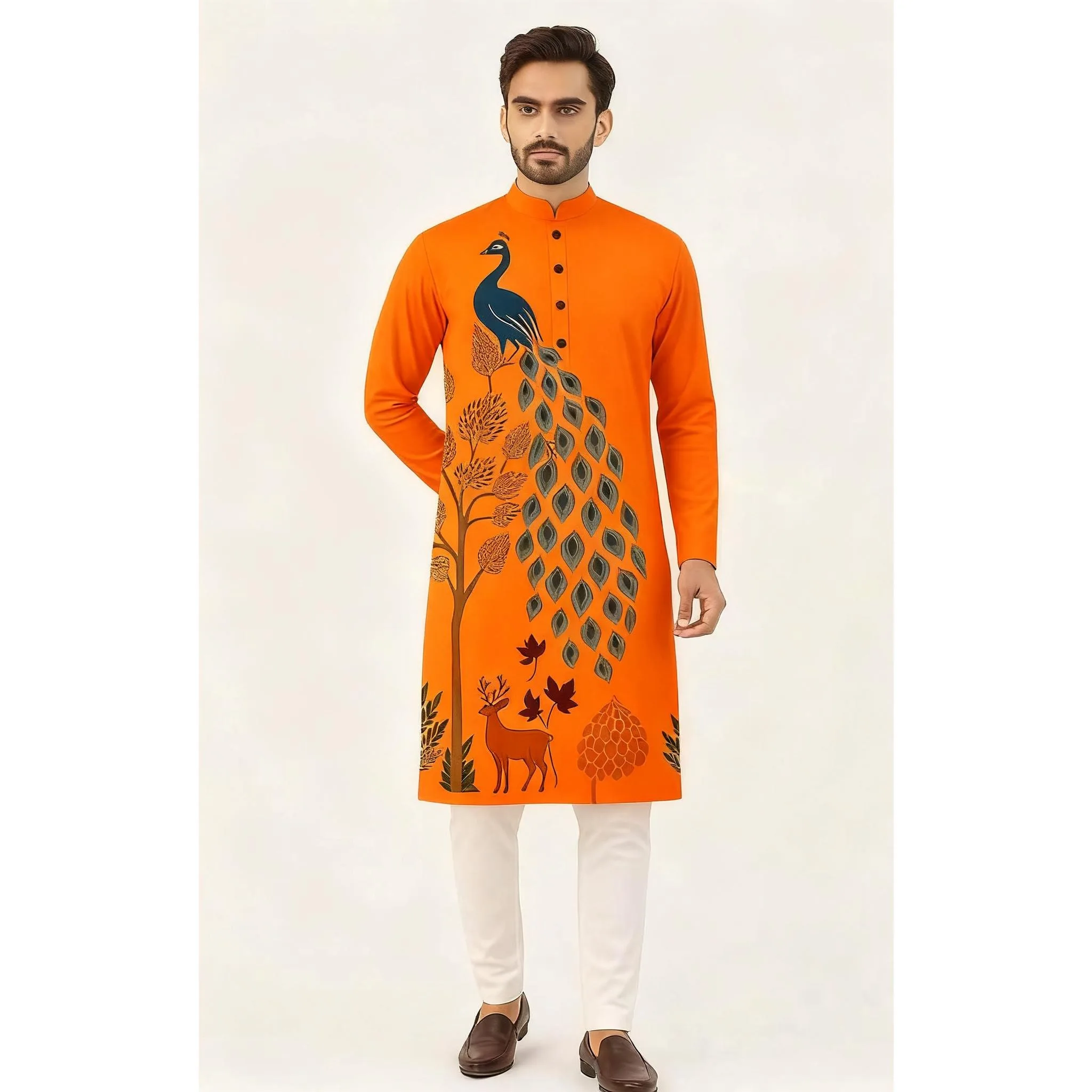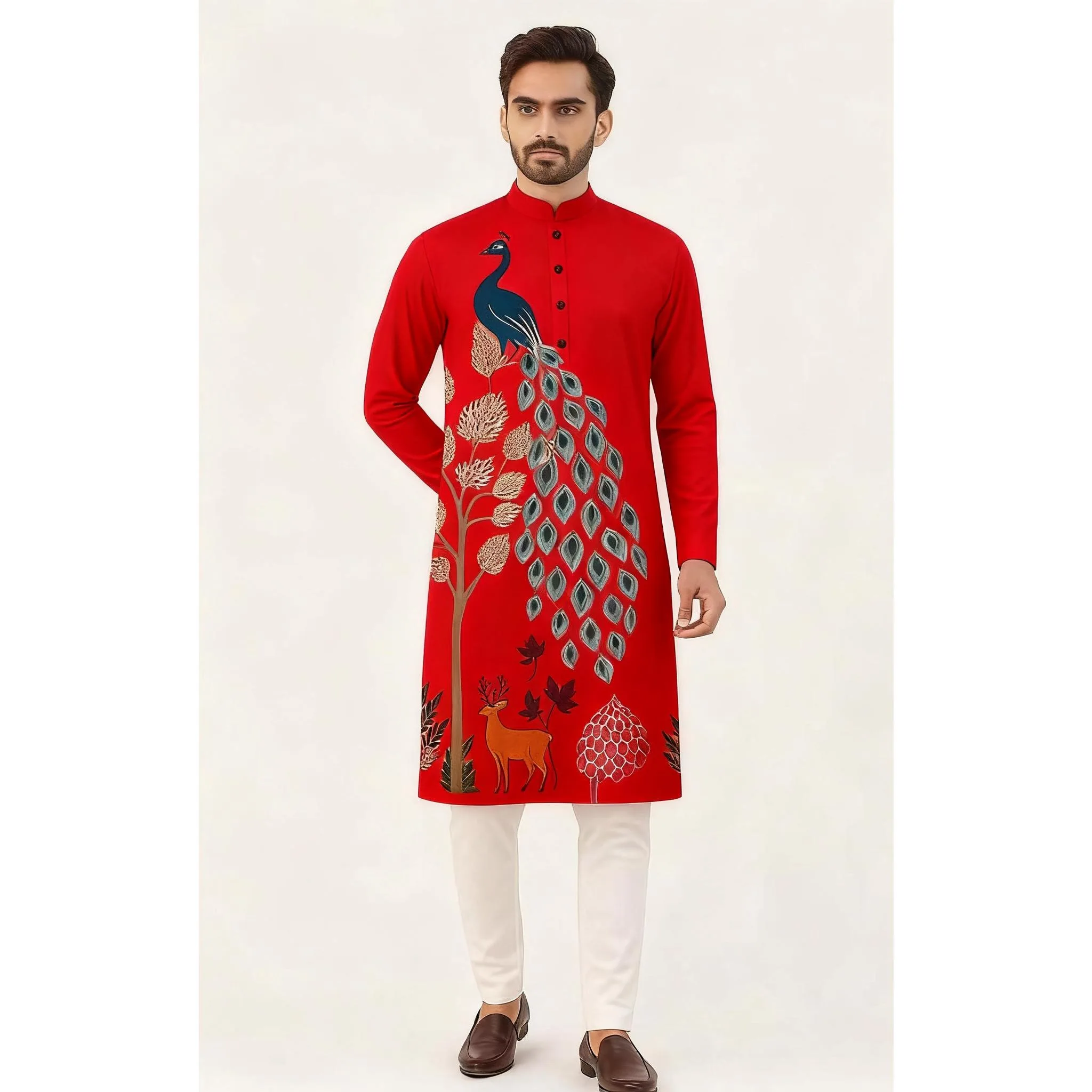 メンズデジタル孔雀柄プリントクルタ・ヴァルダ、レギュラーマンダリンカラー、ロング丈、民族風、結婚式、ハリ・ラヤ、イドリフティリに最適 - TopDealBox